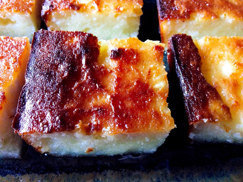 Σε ένα μεγάλο μπολ λιώνουμε με το πιρούνι 1 κιλό λευκό χλωρό τυρί (βλ. tips). Προσθέτουμε 1 φλ. τσ. ζάχαρη, ¾ φλ. τσ. βούτυρο γάλακτος λιωμένο και 6 αυγά χτυπημένα. Ανακατεύουμε με ξύλινη κουτάλα και προσθέτουμε σταδιακά 5 πολύ φουσκωτές κ.σ. αλεύρι για όλες τις χρήσεις. Ανακατεύουμε καλά μέχρι να ομογενοποιηθεί το μίγμα. Βουτυρώνουμε γενναιόδωρα τον πάτο και τα τοιχώματα ενός παραλληλόγραμμου ταψιού διαστάσεων περίπου 30 x 21 εκ. και στρώνουμε το μίγμα. Περιχύνουμε με ¼ φλ. τσ. βούτυρο γάλακτος και ψήνουμε σε προθερμασμένο φούρνο στους 180ο C για περίπου 45΄, μέχρι να ροδίσει όμορφα η επιφάνεια. Όση ώρα ψήνεται το γλυκό ετοιμάζουμε το σιρόπι, βράζοντας για περίπου 30΄, σε αρκετά δυνατή φωτιά, 5 φλ. τσ. νερό με 4 φλ. τσ. ζάχαρη. Το σιρόπι πρέπει να είναι καλά δεμένο. Αποσύρουμε από τη φωτιά και προσθέτουμε τον χυμό από ½ λεμόνι.