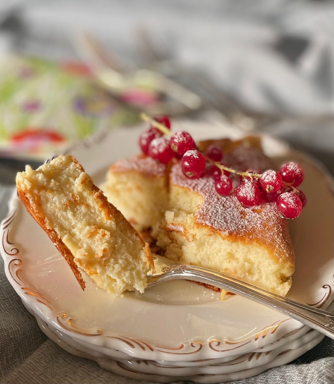 Ρίχνουμε το μίγμα στη φόρμα και ψήνουμε για περίπου 45΄-60΄. Αρχίζουμε να ελέγχουμε εάν το κέικ έχει ψηθεί μέχρι μέσα με ένα μαχαίρι το οποίο θα πρέπει να βγει στεγνό. Αυτό το κάνουμε μόνο αφού θα έχουν περάσει τα πρώτα 45΄, γιατί εάν ανοίξουμε την πόρτα του φούρνου πριν από αυτό το διάστημα, το γλυκό θα ξεφουσκώσει. Το βγάζουμε από τον φούρνο, το αφήνουμε για λίγη ώρα μέσα στη φόρμα και κατόπιν αφαιρούμε τη λαδόκολλα και το βάζουμε σε πιατέλα. Μόλις χλιάνει το πασπαλίζουμε με λίγη ζάχαρη άχνη. Το απολαμβάνουμε χλιαρό ή σε θερμοκρασία περιβάλλοντος και συνοδεύουμε με όποιο κόκκινο φρούτο μας αρέσει. Σαφέστατα ταιριάζουν οι φράουλες, αλλά επέλεξα τα φραγκοστάφυλα λόγω της μεγάλης αδυναμίας που τους τρέφω.