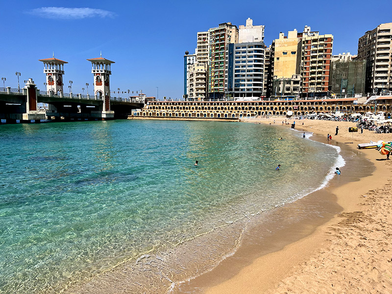 Στις αγαπημένες μας, η παραλία Στάνλεϊ (είσοδος 20 αιγυπτιακές λίρες, κάτι λιγότερο από 0,50€) κάτω από την σούπερ εντυπωσιακή γέφυρα με το ίδιο όνομα, έχει χρυσαφένια αμμουδιά, τέλεια γαλαζοπράσινα νερά, και πλαστικά τραπεζάκια με καρέκλες αντί για ξαπλώστρες, τα οποία δεν χρεώνονται έξτρα –πληρώνεις μόνο ό,τι πάρεις, που μπορεί να είναι τσάι, καφές, χυμοί, αναψυκτικά, ή και απλά νερό.