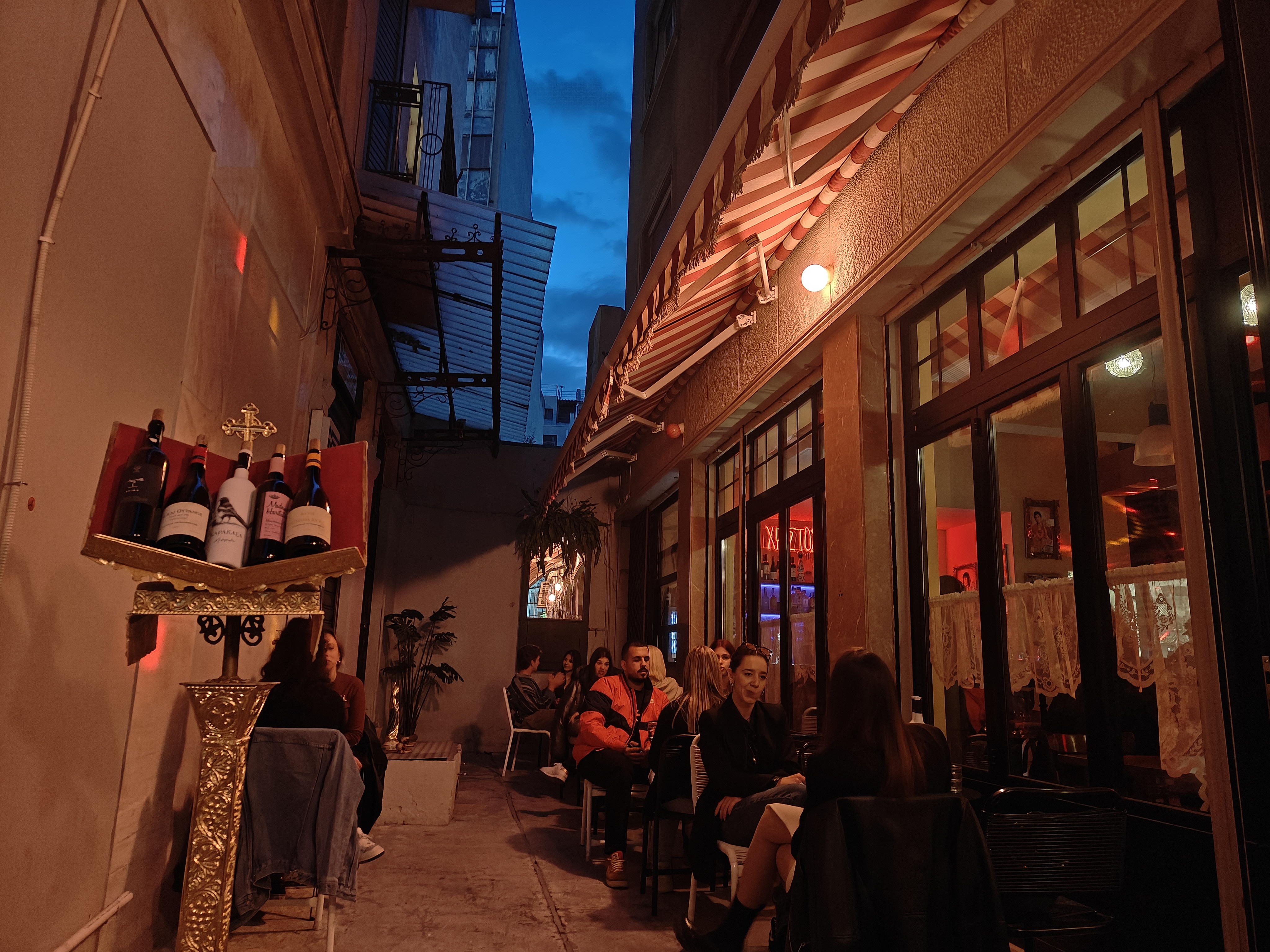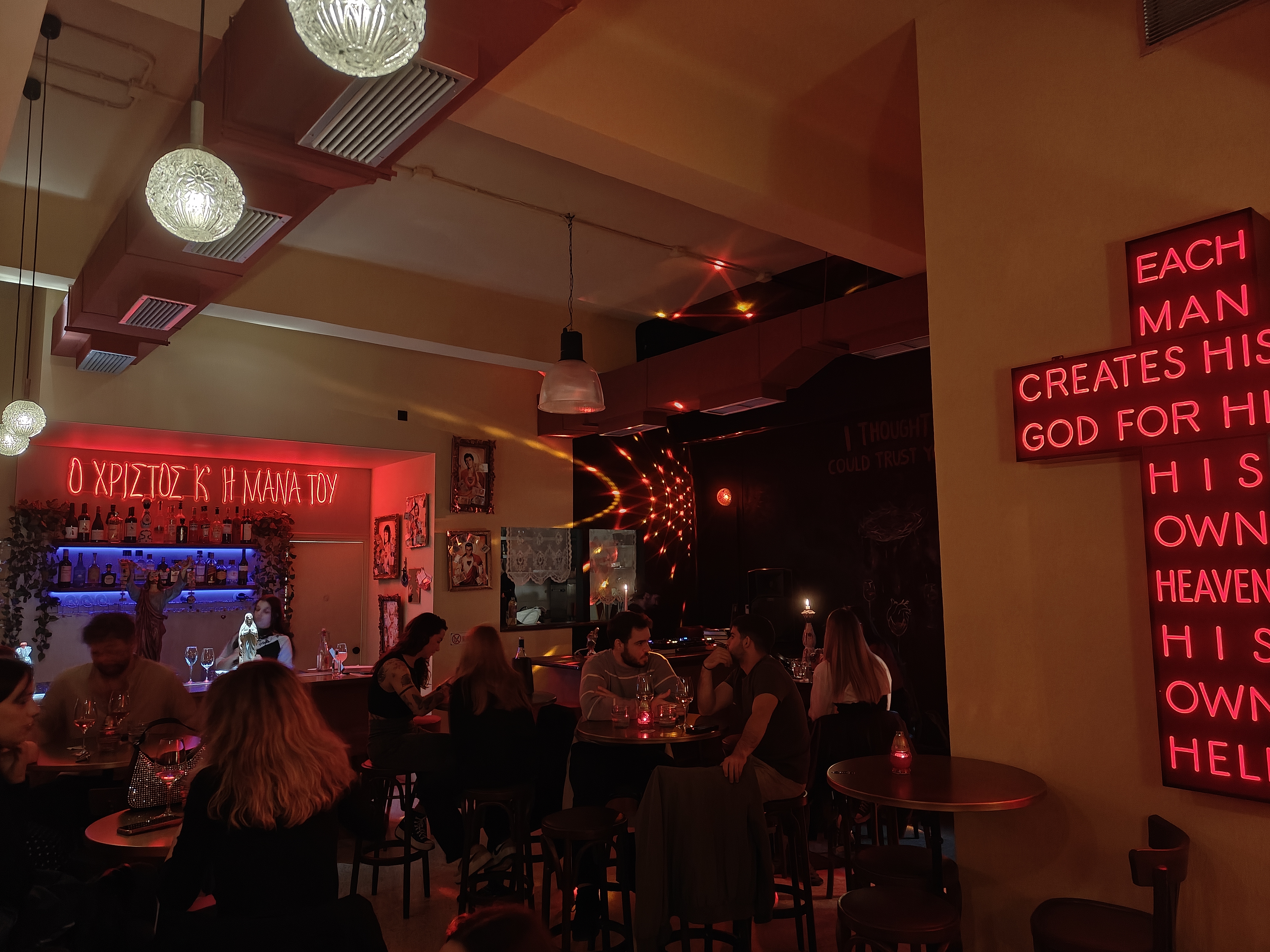 Στον εξωτερικό χώρο, μια ιδιαίτερη «αυλή» σαν σοκάκι, διαθέτει αρκετά τραπεζάκια και ησυχία για να αράξεις, ενώ μέσα η ατμόσφαιρα παίζει σε πορφυρούς τόνους, με τα νέον φώτα, την Παναγία στο μπαρ σε στάση προσευχής και άλλα ιντριγκαδόρικα διακοσμητικά στοιχεία (σταυροί με πιασάρικα μότο, τοιχογραφίες με στεφάνια που στάζουν αίμα και άλλα) που θα σε κάνουν να θες να φωτογραφίσεις κάθε τετραγωνικό.