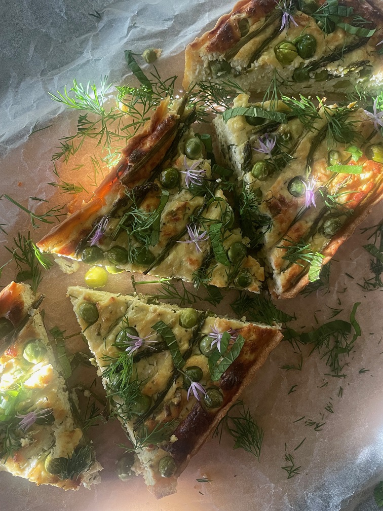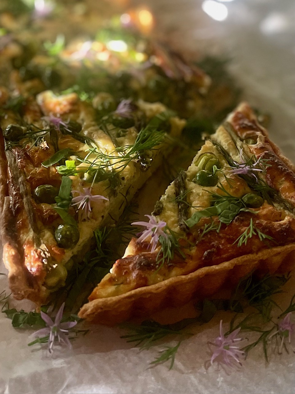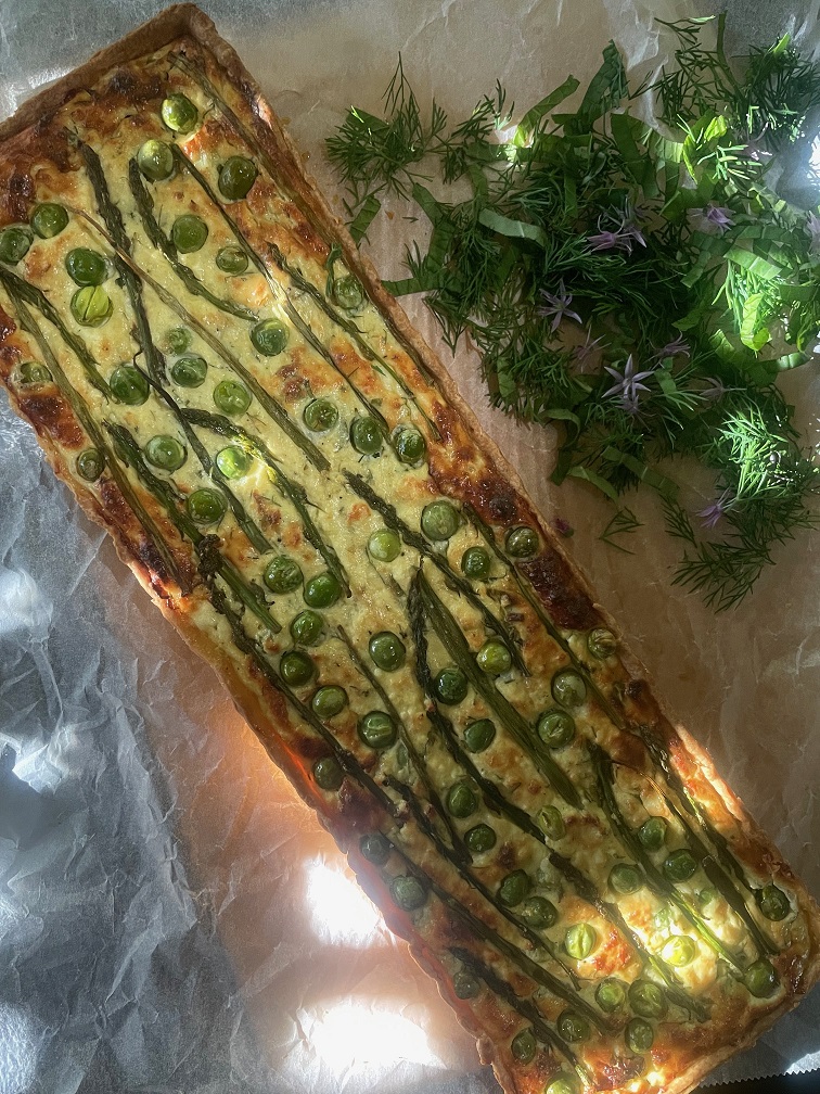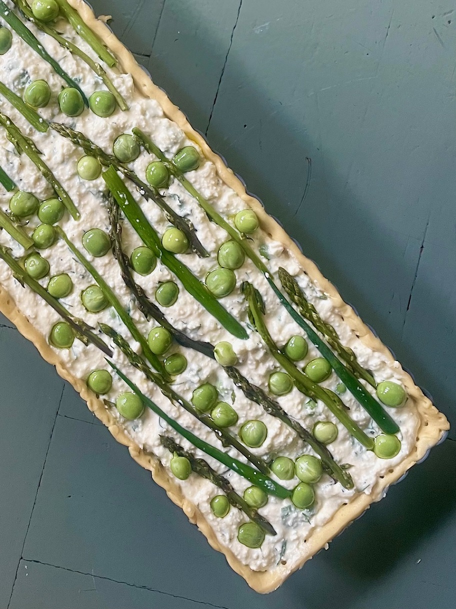 Η Αγάπη μάς κερνάει μια τάρτα με χλωρό τυρί, αρακά, σπαράγγια και μυρωδικά που μοσχοβολάει άνοιξη.