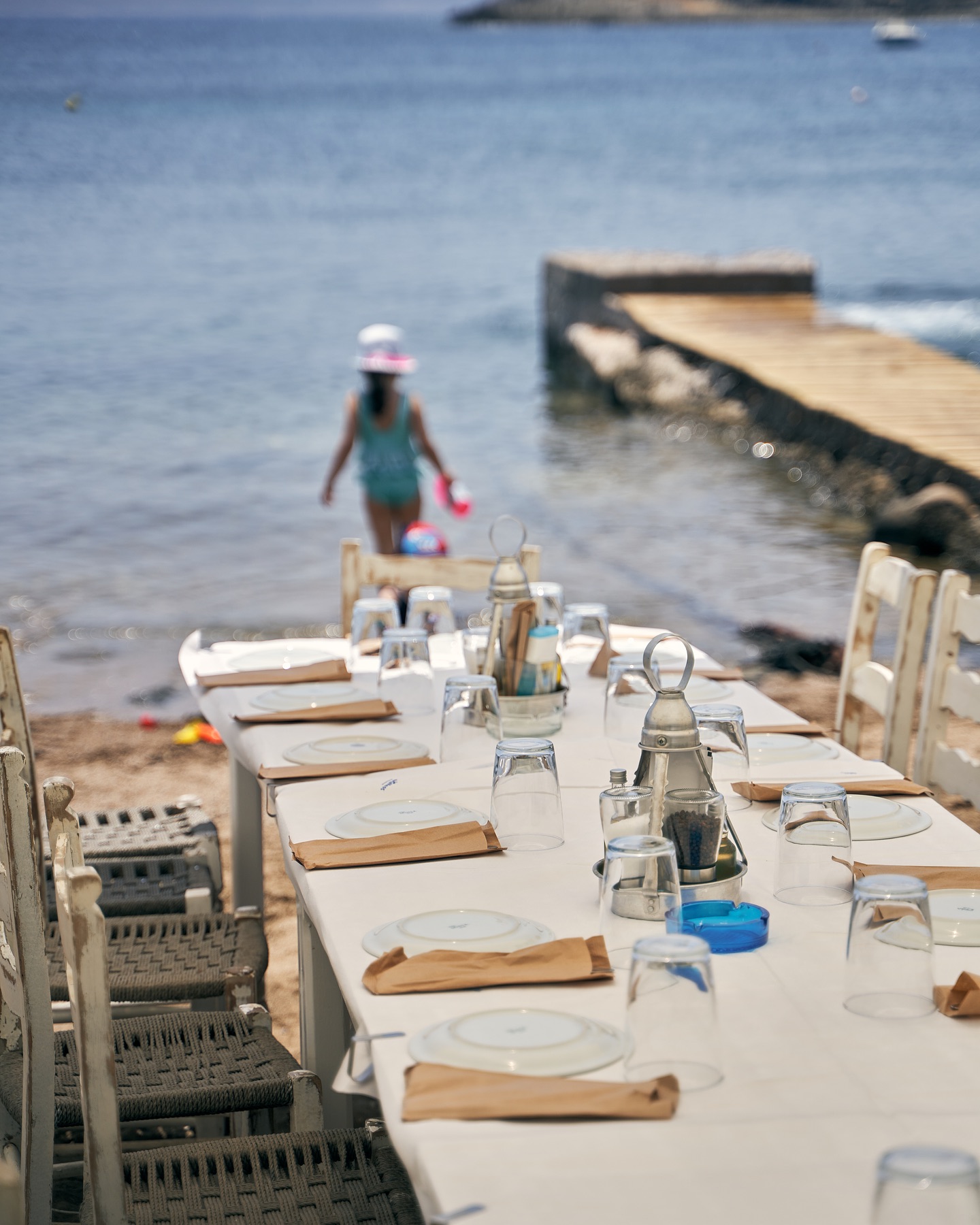 Ο χώρος παραπέμπει ευθέως σε νησί, με τις λευκές του καρεκλίτσες, τα ασβεστωμένα πεζούλια και την καλαμωτή που κάνει τέλεια σκιά τα μεσημέρια –αν και κάτι μας λέει ότι τέτοια εποχή, που δεν έχεις χορτάσει ακόμα ήλιο, θα πιάσεις ένα από τα τραπεζάκια που απλώνονται πιο έξω, επάνω στην αμμουδιά. Παραγγέλνεις ούζο και ξεκινάς τα πρώτα διακοποσχέδια, γιατί αν όχι εδώ, τότε πού;