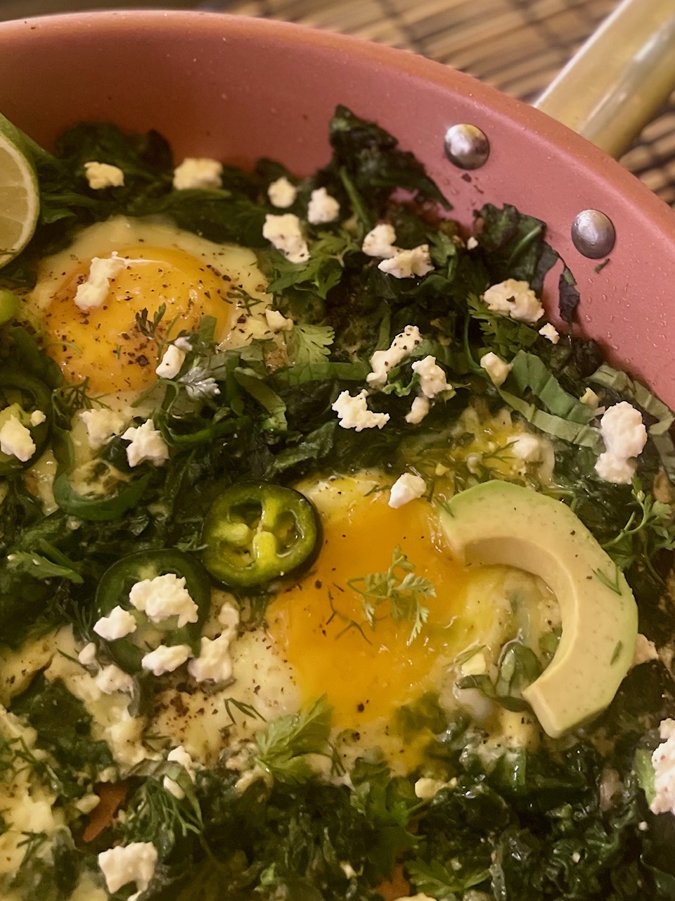 ΠΡΑΣΙΝΗ SHAKSHUKA ΜΕ ΣΠΑΝΑΚΙ, ΒΟΤΑΝΑ, ΑΒΟΚΑΝΤΟ & ΦΕΤΑ