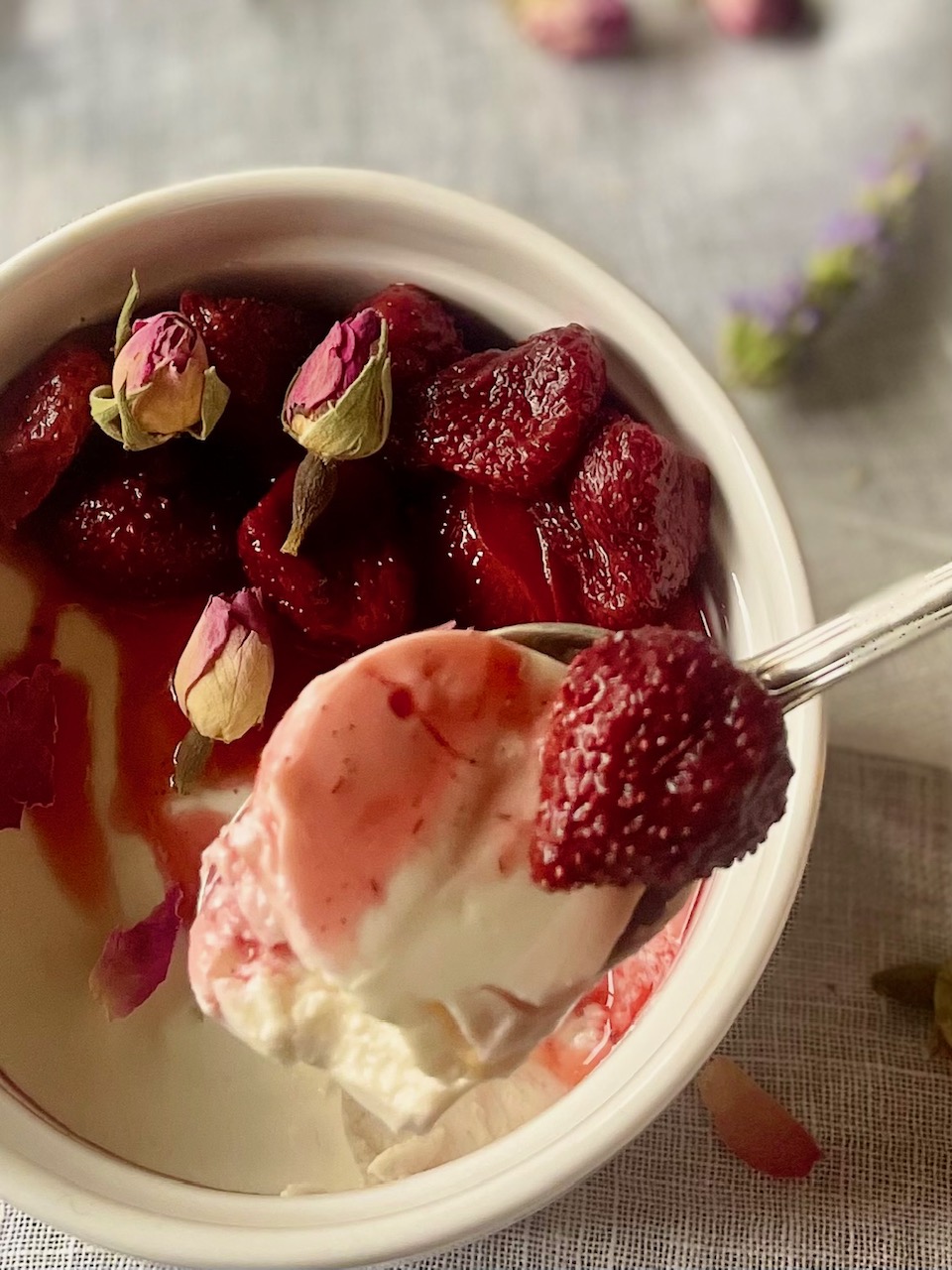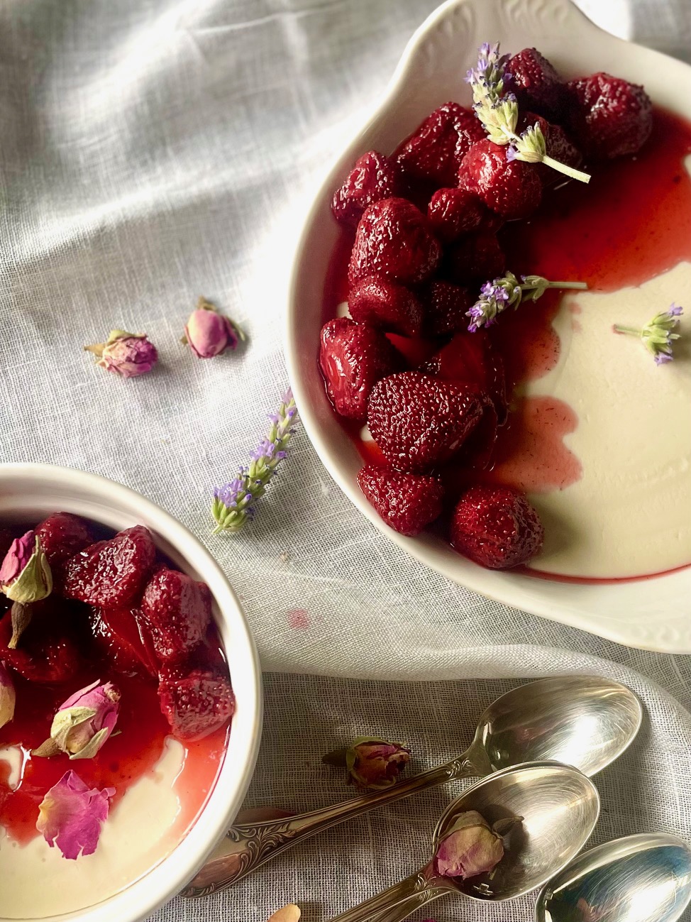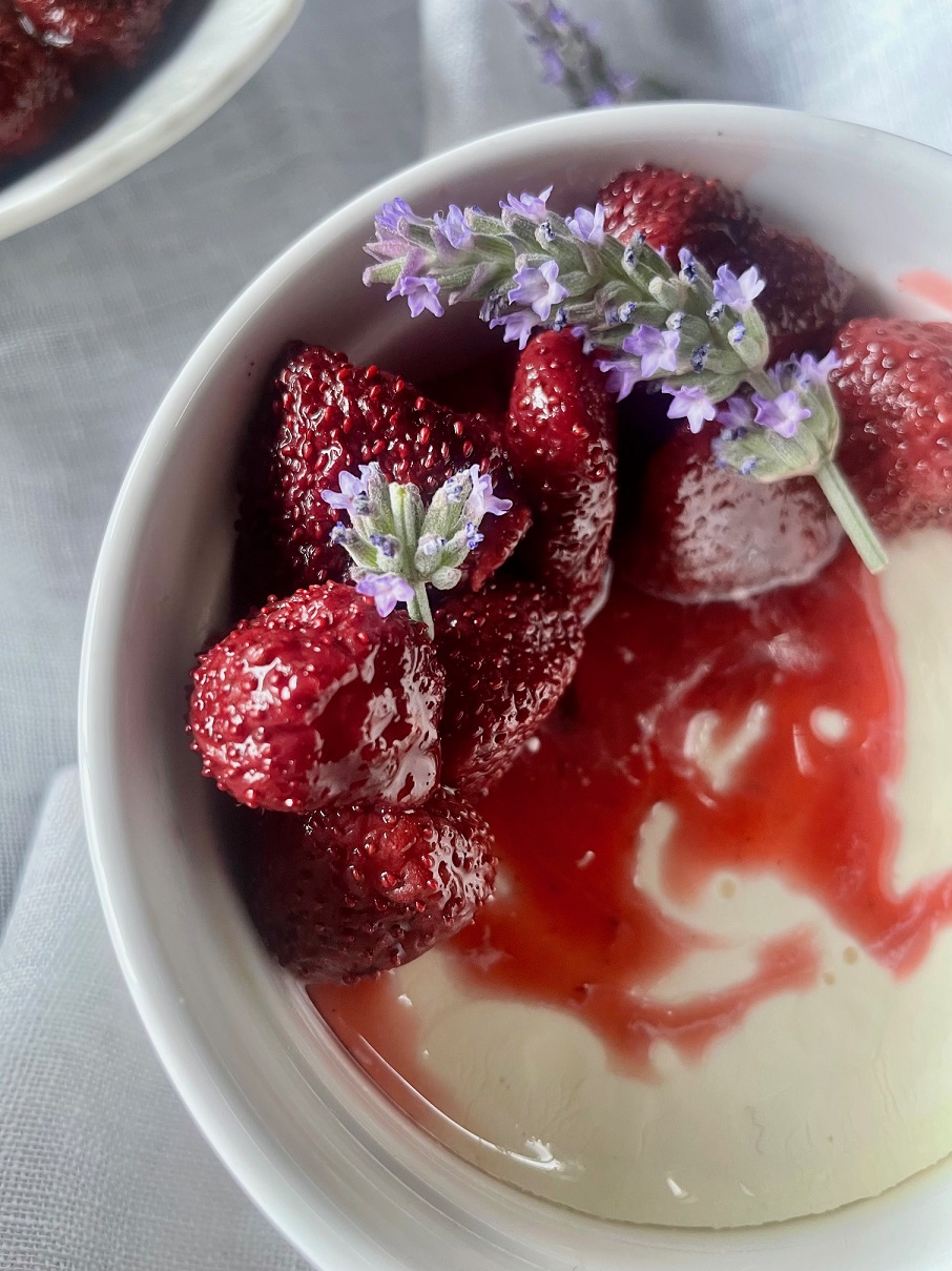 Σερβίρουμε συνοδεύοντας με φράουλες, περιχυμένες με λίγο μέλι και αρωματισμένες με βανίλια και λίγο μαύρο πιπέρι, που έχουμε ψήσει στον φούρνο για λίγη ώρα μέχρι τα φρούτα να μαλακώσουν και να αφήσουν υγρά που θα γίνουν ελαφρύ σιρόπι με το μέλι. Συντηρούνται στο ψυγείο για αρκετές μέρες, απλώς θα μαλακώσουν περισσότερο λόγω του σιροπιού.