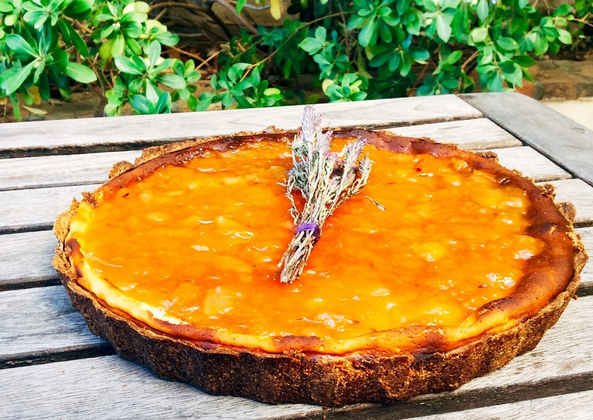 Στο μπολ του μίξερ, χτυπάμε με το σύρμα 2 κεσεδάκια στραγγιστό γιαούρτι με ½ φλ. τσ. ζάχαρη, έως ότου λιώσει η ζάχαρη. Αρωματίζουμε με ξύσμα από 1 μεγάλο λεμόνι και τα σποράκια από μισό λουβί βανίλιας ή 1 κ.γλ. καλής ποιότητας extrait βανίλιας. Προσθέτουμε 2 αυγά και χτυπάμε μέχρι να ομογενοποιηθεί η κρέμα. Τη στρώνουμε πάνω από την ψημένη ζύμη και ψήνουμε σε προθερμασμένο φούρνο, πάντα στους 180ο C, για 35΄- 40΄. Η κρέμα πρέπει να ψηθεί στις άκρες και να μείνει ελαφρώς τρεμουλιαστή στη μέση. Αφήνουμε την τάρτα να κρυώσει εντελώς σε θερμοκρασία δωματίου για τουλάχιστον μία ώρα και κατόπιν παγώνουμε στο ψυγείο. Την ώρα του σερβιρίσματος ξεφορμάρουμε την τάρτα και καλύπτουμε την επιφάνεια με μαρμελάδα της αρεσκείας μας.
