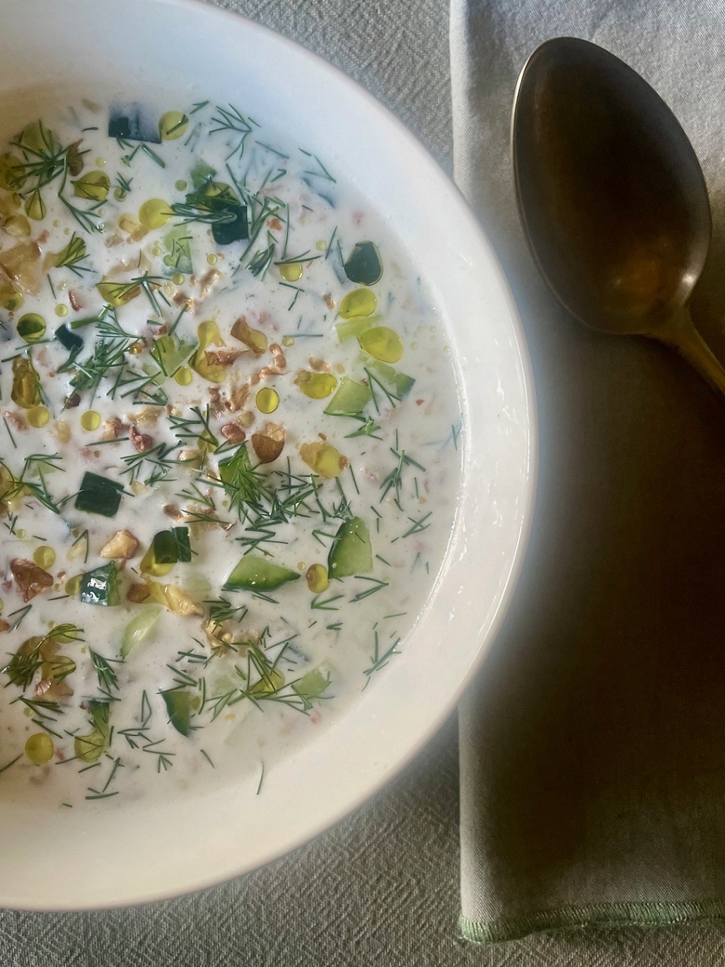 Σε ένα τηγάνι καβουρδίζουμε σε μέτρια φωτιά μια χούφτα καρύδια, ανακατεύοντας συνεχώς για να μην καούν και πικρίσουν. Τα χοντροκόβουμε μόλις κρυώσουν. Πλένουμε ένα σφιχτό αγγούρι, το κόβουμε στη μέση κατά μήκος, αφαιρούμε το μεσαίο κομμάτι, το οποίο ακόμα κι αν δεν έχει σπόρια είναι πιο μαλακό και υδαρές και κόβουμε το υπόλοιπο σε μικρούς κύβους, σαν το μικρό μας νύχι.. Ψιλοκόβουμε μια γεμάτη χούφτα άνηθο. Σε ένα μεγάλο μπολ βάζουμε το αγγούρι, τα περισσότερα καρύδια και τον περισσότερο άνηθο, 400 γρ. στραγγιστό γιαούρτι, αλατοπίπερο και 1-2 σκ. σκόρδου, τριμμένες ή πολτοποιημένες. Αραιώνουμε με λίγο παγωμένο νερό και ανακατεύουμε. Την βάζουμε στο ψυγείο. Την ώρα του φαγητού τη μοιράζουμε σε βαθιά πιάτα και στολίζουμε με τα καρύδια και τον άνηθο που κρατήσαμε. Προσθέτουμε λίγες σταγόνες ελαιόλαδο και απολαμβάνουμε.