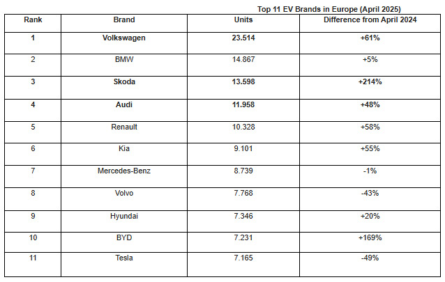 Συνολικά, η Volkswagen κατάκτησε την 1η θέση μεταξύ όλων των κατασκευαστών καταγράφοντας 23.514 πωλήσεις ηλεκτρικών οχημάτων τον Απρίλιο, σημειώνοντας αύξηση +61% σε σύγκριση με τον ίδιο μήνα πέρυσι. Η Skoda, με 13.598 πωλήσεις και άνοδο +214%, βρέθηκε στην 3η θέση, ενώ η Audi κατέλαβε την 4η θέση, με 11.958 πωλήσεις και αύξηση +48%. Τα αποτελέσματα αυτά εδραιώνουν τον Όμιλο Volkswagen ως την κορυφαία δύναμη στην ευρωπαϊκή αγορά ηλεκτρικών οχημάτων.