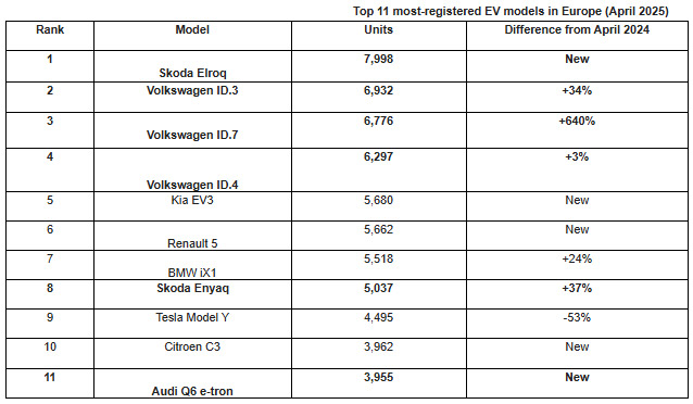 Στην πρώτη θέση των πωλήσεων βρέθηκε το Skoda Elroq, το νέο πλήρως ηλεκτρικό compact SUV, με 7.998 ταξινομήσεις σε ολόκληρη την Ευρώπη και το Ηνωμένο Βασίλειο. Στην 2η, 3η και 4η θέση αντίστοιχα, βρέθηκαν τα ηλεκτρικά μοντέλα της οικογένειας ID. της Volkswagen: