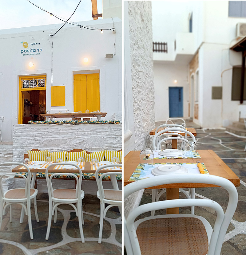 «Μα καλά, ήρθαμε στην Κύθνο για να φάμε ιταλικό;» σε ακούμε να ρωτάς, κι από αυτό καταλαβαίνουμε ότι δεν έχεις ακουστά το Positano. Μια δοκιμή όμως θα σε πείσει για του λόγου μας το αληθές: Πέρνα από την κεντρική πλατεία της Χώρας στο εσωτερικό του εστιατορίου, για να βγεις από εκεί στο σχεδόν μυστικό, πίσω δρομάκι, όπου τα ξύλινα τραπέζια απλώνονται στο πλακόστρωτο και το υπερυψωμένο μπαλκόνι του και φωτίζονται ατμοσφαιρικά από κρεμαστά φώτα που φτιάχνουν με τη μία σκηνικό «νοσταλγικό καλοκαίρι σε νησί».
