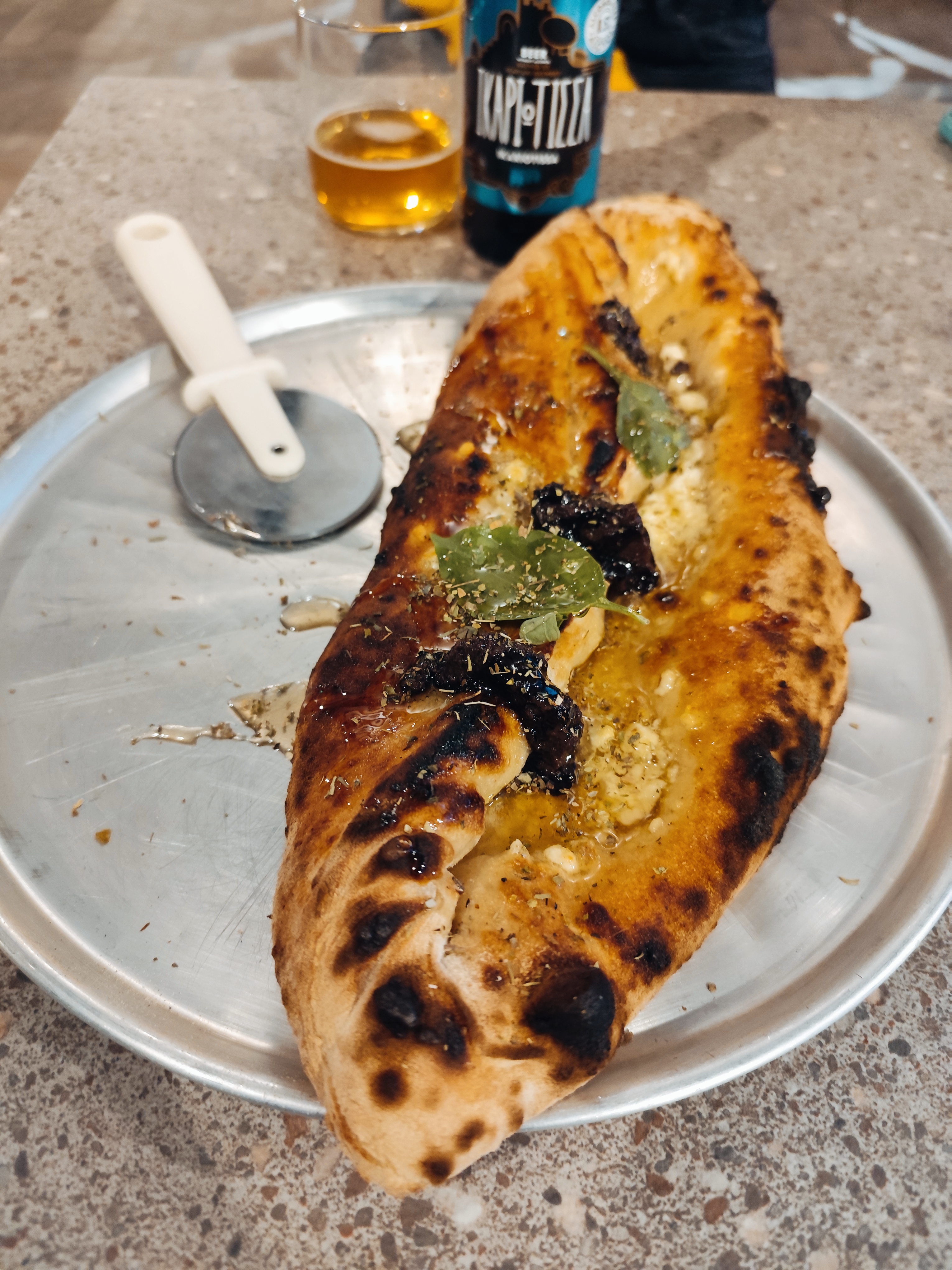 Το ζυμάρι εδώ όπως και στην πίτσα, κάνει τη μεγάλη διαφορά. Προζυμένιο για 72 ώρες είναι πανάλαφρο και χωρίς καμία περιττή λαδίλα που θεριεύει τα φουσκώματα. Πρώτη από τις πίτσες του καταλόγου δοκιμάσαμε την καλτσόνε (10€) Feta n Honey με βαρελίσια φέτα, μέλι Ελάτης, πάστα ελιάς καλαμών και θυμάρι. By far η πιο ελληνική πίτσα που έχουμε δοκιμάσει σε ένα πείραμα που πέτυχε και με το παραπάνω συστήνοντάς μας έναν νέο γαστρονομικό εθισμό.