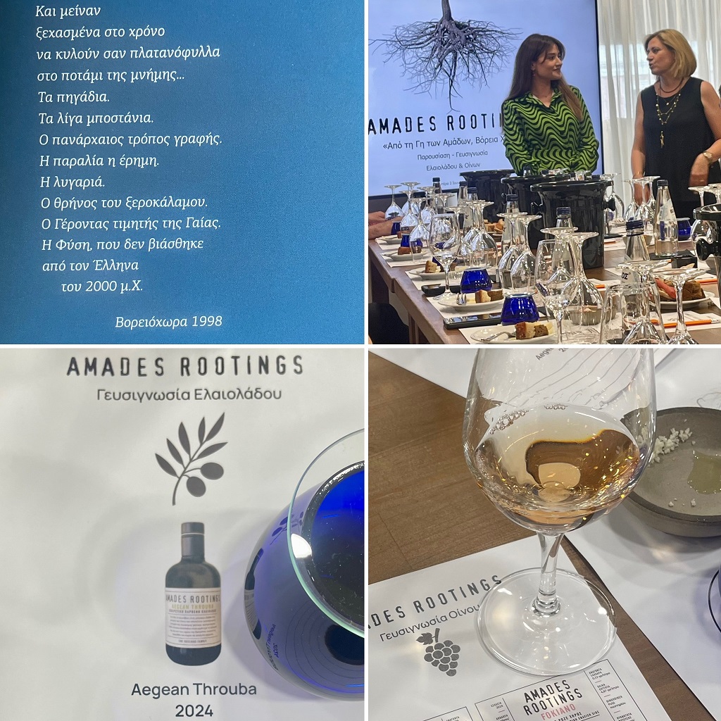 Η γευσιγνωσία των οίνων έγινε υπό την καθοδήγηση του συμβούλου-οινολόγου της οικογένειας Δρ. Γεωργίου Κοτσερίδη, καθηγητή οινολογίας του Γεωπονικού Πανεπιστημίου Αθηνών. Ο Δρ. Κοτσερίδης παρουσίασε 4 διαφορετικές μονοποικιλιακές ετικέτες Amades Rootings, εσοδείας 2024, από τις ποικιλίες Μπεγλέρι, Φωκιανό, Αυγουστιάτη και Μαυροτράγανο, ενώ έκπληξη αποτέλεσε ο Αυγουστιάτης του 2022, που είχε εμφιαλωθεί κατά την πρώτη πειραματική οινοποίηση. Ο Δρ Κοτσερίδης αναφέρθηκε, επίσης, στη φημισμένη λευκή ποικιλία του Αιγαίου, το Ασύρτικο, η οποία καλλιεργείται στους αμπελώνες του κτήματος και αναμένεται να δώσει τα επόμενα χρόνια εξαιρετικά αποτελέσματα σύμφωνα με την εμπειρία που αποκτήθηκε από τις πρώτες δοκιμές που έχουν γίνει.