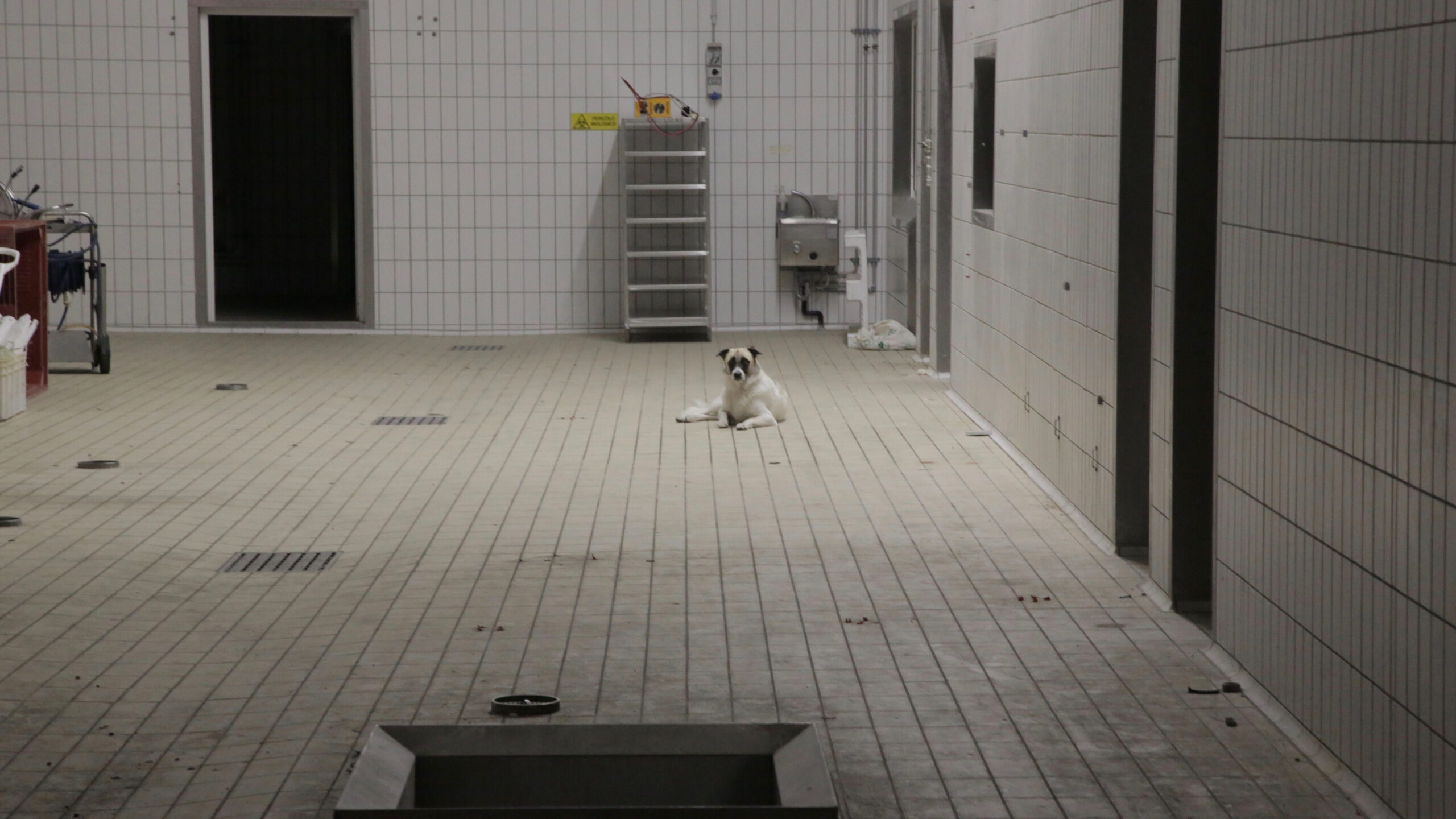 Ο Igor Grubić με το Ingresso Animali Vivi μάς βάζει, κυριολεκτικά, στη θέση του ζώου. Μέσα σ’ ένα ιταλικό σφαγείο, η κάμερα υιοθετεί την οπτική ενός σκύλου –του μοναδικού που θα βγει ζωντανός. «Άραγε τα ζώα που γεννιούνται αιχμάλωτα ονειρεύονται την ελευθερία; Έχουν συναίσθηση πως εκτρέφονται ως προϊόντα; Αυτά είναι κάποια από τα ερωτήματα που θέτει ο Igor Grubić στο πιο πρόσφατο πειραματικό του φιλμ Ingresso Animali Vivi (Είσοδος Ζωντανών Ζώων). Κινηματογραφημένη κατά τη διάρκεια της νύχτας μέσα σ’ ένα ιταλικό σφαγείο, η ταινία είναι διασταύρωση μεταξύ ντοκιμαντέρ και μυθοπλασίας. O πρωταγωνιστής –ένας σκύλος– είναι το μόνο ζώο που μπαίνει σε τούτη τη στοιχειωμένη από τη φρίκη αίθουσα και βγαίνει ζωντανό. Ο Grubić υιοθετεί μια μη ανθρώπινη οπτική γωνία για να τονίσει την ενσυναίσθηση και τη συμπόνια του πρωταγωνιστή του για τα ζώα που προορίζονται από τη γέννησή τους να καταναλωθούν ως προϊόντα στο τραπέζι μας: η σκελετωμένη, φασματική παρουσία τους πλανάται παντού σε τούτη τη «βιομηχανία του θανάτου» διαβάζουμε στον οδηγό της έκθεσης.