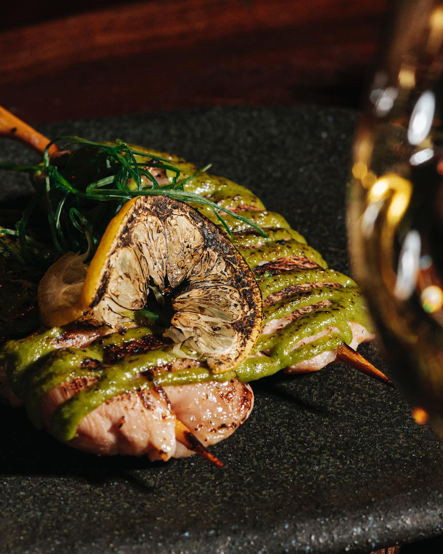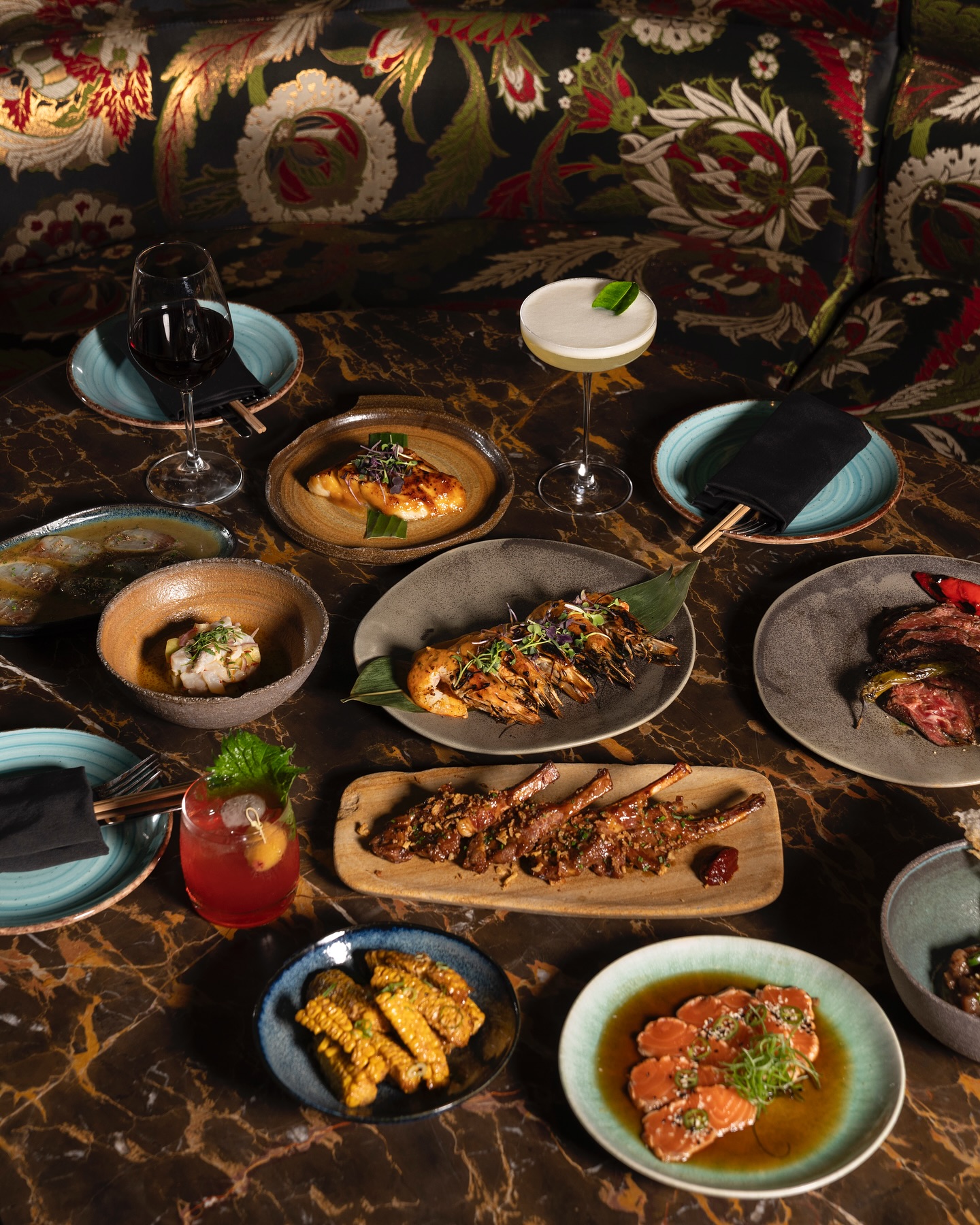 Ακολούθησαν τα rolls με σολομό (20€) τζίντζερ, αβοκάντο, φρέσκο κρεμμύδι, καπνιστό χέλι κι αγιολί που μας απέδειξαν ότι η ασιατική γαστρονομική πυξίδα του WooWoo δείχνει προς τον σωστό δρόμο, ενώ τα chopsticks μας πήραν φωτιά. Τα Yakitori (5€)–ιαπωνικά σουβλάκια με κοτόπουλο- ήταν άκρως ζουμερά, σφριγηλά και πολύ νόστιμα με υποδειγματικό ψήσιμο. Σειρά είχε το απόλυτο χιτ του καταλόγου (και -εκ του γευστικού αποτελέσματος- αγαπημένο μας πιάτο), οι γαρίδες Piri Piri (24€) τις οποίες λούσαμε δις και τρις με την υπέροχη πηχτή σάλτσα από κόλιανδρο, λάιμ και καρύδα. Τα τάκος (24€) με striploin από Black Angus, Hoizin σως –γιατί η καντονέζικη κουζίνα πάντα στο τέλος δικαιώνεται- αβοκάντο και τσίλι ήταν μικρές παραδεισένιες μπουκιές και μας προϊδέασαν για την υπέροχη μοσχαρίσια ταλιάτα (38€) που ξύπνησε steak house μνήμες, μιας ήταν ψημένη ολόσωστα κρατώντας τους πλούσιους χυμούς του premium κρέατος. Συνοδευόταν από corn ribs και jalapenos πιπεριές δημιουργώντας μια χρωματική πανδαισία στο πιάτο μας.