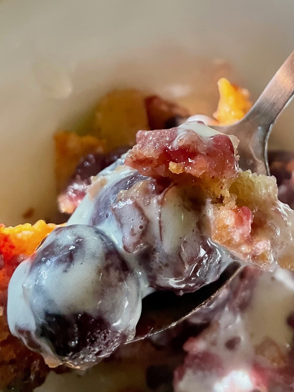 Ας εξηγήσω, όμως, τι είναι ακριβώς το cobbler, για όσους από εσάς δεν το γνωρίζετε. Είναι ένα γλυκό που συνδυάζει ώριμα φρούτα με ένα είδος ζύμης κέικ, πιο αραιής από τη συνήθη. Τα φρούτα μπαίνουν στον πάτο ενός πυρίμαχου σκεύους, από πάνω μπαίνει η ζύμη και καθώς το σύνολο ψήνεται και η ζύμη φουσκώνει, τα φρούτα καλύπτονται σχεδόν εντελώς από αυτήν. Καθώς, δε, ψήνονται, βγάζουν τα ζουμιά τους που καραμελώνουν. Η ζύμη δεν είναι συμπαγής, αντιθέτως το γλυκό στην όψη μοιάζει με τα λιθόστρωτα καλντερίμια, εξ ου και το όνομα cobbler (cobblestones ονομάζονται οι πέτρες που χρησιμοποιούνται για το στρώσιμο των καλντεριμιών).