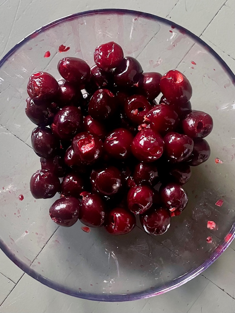 Προθερμαίνουμε τον φούρνο στους 180ο C στη λειτουργία του αέρα. Πλένουμε και αφαιρούμε τα κουκούτσια από 500 γρ. κεράσια. Αυτή είναι η μοναδική χρονοβόρα και μπελαλίδικη εργασία. Σας συνιστώ να την κάνετε μέσα στον νεροχύτη σε βαθύ μπολ για να μην κάνετε την κουζίνα γης μαδιάμ. Αν, δε, όπως με συμβούλευσε μια φίλη, καταψύξτε τα κεράσια για 3-4 ώρες, η δουλειά γίνεται ακόμη πιο καθαρά και με λιγότερο κόπο.