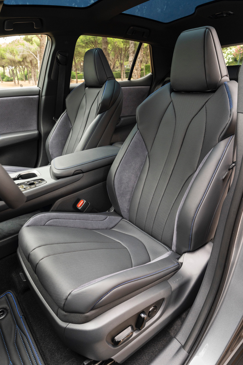 Το εσωτερικό είναι ντυμένο σε αποχρώσεις του μαύρου και του σκούρου γκρι, ώστε να αποπνέει σπορ αίσθηση και ήρεμη δύναμη. Η επένδυση Ultrasuede κοσμείται από μπλε ραφές αντίθεσης – το χαρακτηριστικό χρώμα της σειράς Lexus Electrified.