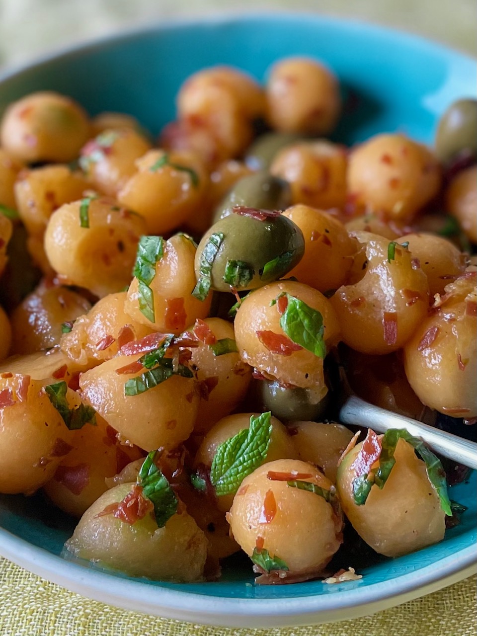 Στον κλασικότατο συνδυασμό πεπόνι-προσούτο προσθέτουμε πράσινες ελιές που δίνουν μια πολύ ευχάριστη και φίνα υπόξινη νότα, συμπληρώνοντας το αρωματικό προφίλ της σαλάτας.