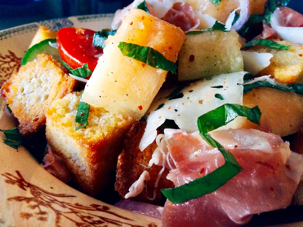 ΣΑΛΑΤΑ ΣΑΝ PANZANELLA ΜΕ ΠΕΠΟΝΙ, PROSCIUTTO & ΓΡΑΒΙΕΡΑ
