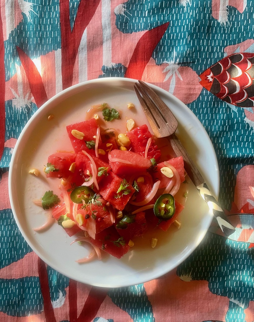 Σαλάτα: Κόβουμε δύο μεγάλες φέτες καρπουζιού σε κύβους, αφαιρούμε τα κουκούτσια και τους βάζουμε σε μπολ, παίρνοντας και τα ζουμιά που έχουν αφήσει. Αλατίζουμε ελαφρά και προσθέτουμε φέτες πικλαρισμένου κρεμμυδιού μαζί με λίγο από το ζουμί τους, παίρνοντας και λίγα από τα αρωματικά υλικά (πιπέρια, σπόρους κόλιαντρου, μαραθόσπορους, κ.λπ.). Προσθέτουμε μία καυτερή πιπεριά jalapeno (ή chili) κομμένη σε λεπτές φέτες με ή χωρίς τα σπόρια, ανάλογα με το πόσο μας αρέσουν τα πικάντικα. Αρτύζουμε με εξαιρετικό παρθένο ελαιόλαδο και χυμό από μοσχολέμονο (lime). Προσθέτουμε φυλλαράκια φρέσκου κόλιανδρου. Ανακατεύουμε απαλά. Βάζουμε το μπολ για λίγη ώρα στο ψυγείο για να δροσίσει η σαλάτα και να αναμιχθούν τα αρώματα (δεν την τρώμε όμως εντελώς παγωμένη). Λίγο πριν να την φάμε πασπαλίζουμε με δύο χούφτες χοντροσπασμένα peanuts, ανακατεύουμε απαλά και απολαμβάνουμε.