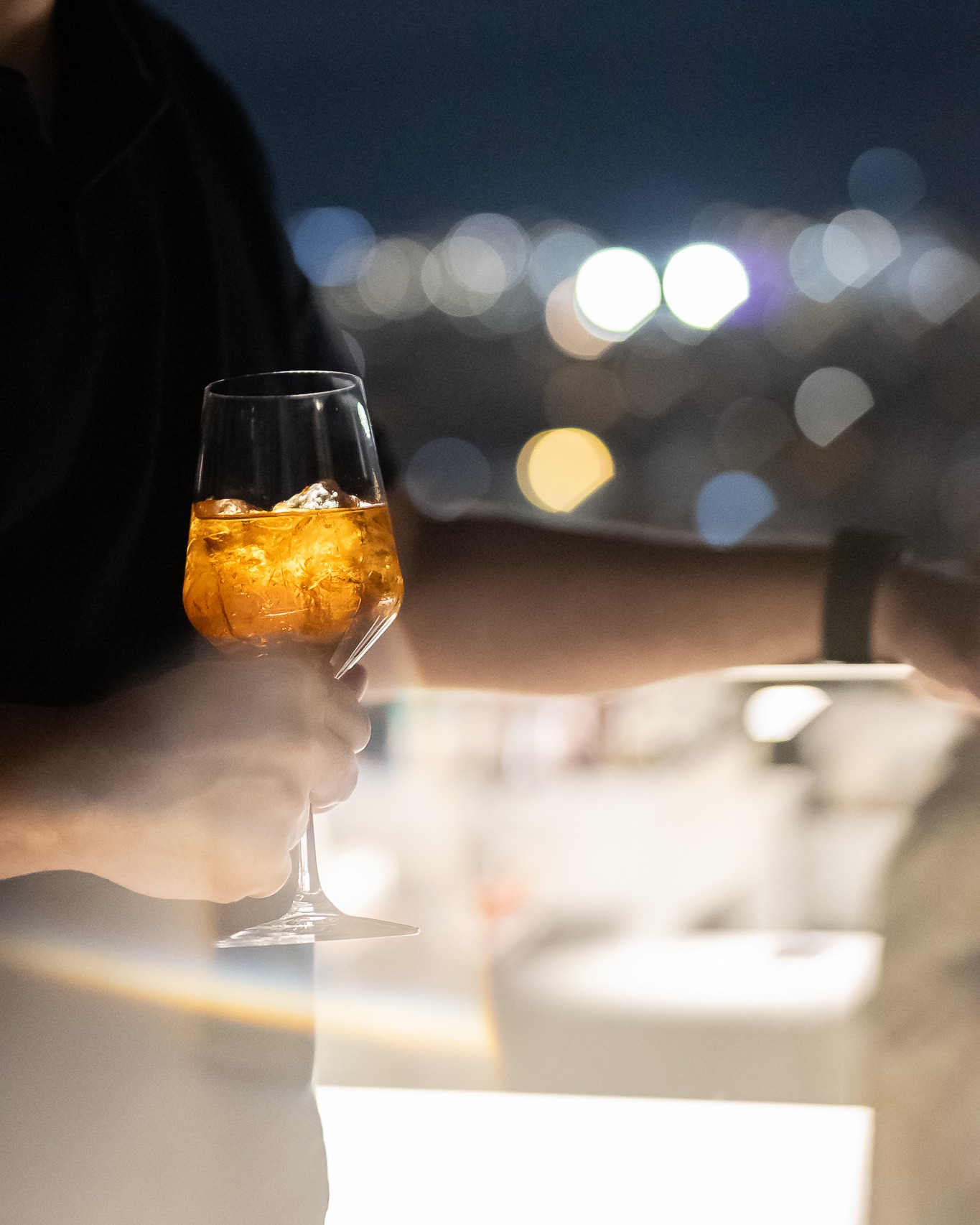 Μετά από έναν παρατεταμένο καύσωνα, το δροσερό αεράκι που έντυσε τη βραδιά μας έμοιαζε βάλσαμο μπρος στα αποπνικτικά μεσημέρια που περάσαμε τις προηγούμενες μέρες. Την ώρα του δειλινού ο αττικός ουρανός φόρεσε τα πιο όμορφα χρώματα του αντανακλώντας στην μικρή πισίνα του rooftop. Μας ανάγκασε λοιπόν να σηκωθούμε από τις θέσεις μας, αφήνοντας στη μέση την ανάγνωση των menu και της winelist για να απαθανατίσουμε φωτογραφικά τη στιγμή.