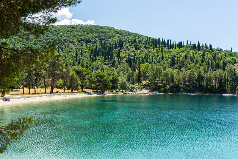 Πάμε προς Ιόνιο μεριά και στο νησί του Οδυσσέα. Η Ιθάκη, εκτός από τα κρυστάλλινα νερά και το ήσυχο τοπίο, κρύβει παραλίες ιδανικές για όσους αναζητούν ανάπαυλα από τον ήλιο. Στον Σκίνο, τα πεύκα, τα κυπαρίσσια και οι φοίνικες συνθέτουν μια κατάφυτη ακτογραμμή που προσφέρει δροσερά σημεία όλη μέρα, πλάι σε ήρεμα, ρηχά νερά. Λίγο πιο δίπλα, η παραλία Μνήματα, κρυμμένη ανάμεσα σε ευκαλύπτους και πεύκα, θυμίζει παλιό μυστικό του νησιού, ενώ παραμένει εύκολα προσβάσιμη. Στο Γιδάκι, η πλούσια βλάστηση ενώνεται με το τοπίο για μια πραγματικά φυσική εμπειρία, την προσεγγίζεις με σκάφος ή από μονοπάτι. Αν ψάχνεις παραλία κοντά στο Βαθύ, η Δεξά είναι ό,τι πρέπει, με ήσυχα νερά και αίσθηση απομόνωσης, ενώ ο Μπροστά Αετός, ευρύχωρος και προσβάσιμος, συνδυάζει καταγάλανα νερά και δέντρα που προσφέρουν απλόχερα δροσιά.