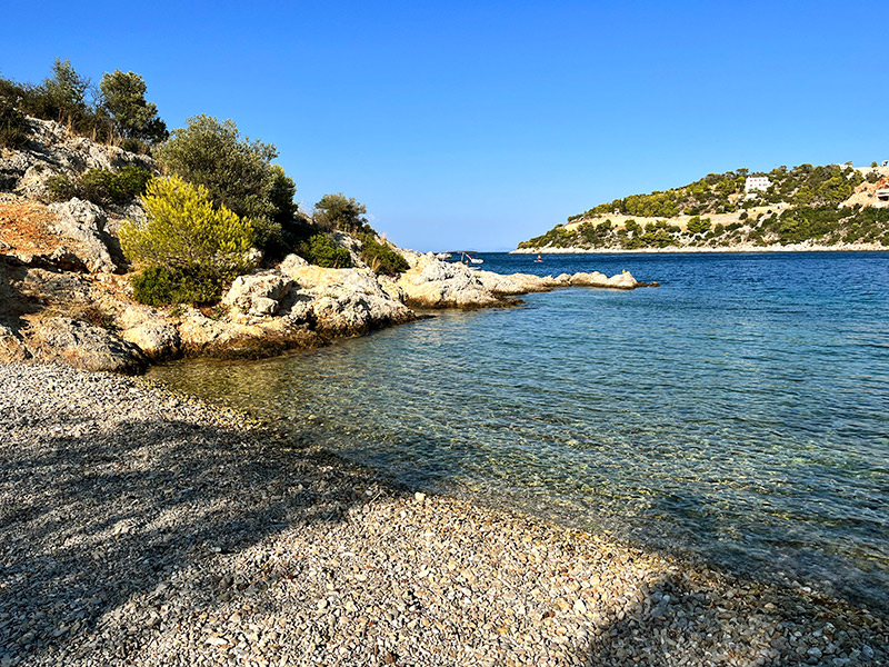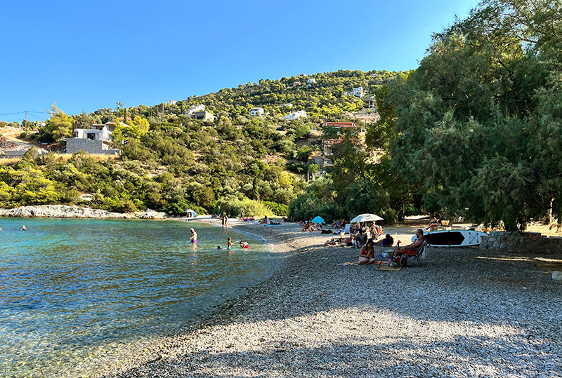 Τόσα δέντρα σε παραλία δύσκολα έχεις ξαναδεί: Φουντωτά αρμυρίκια, ναι, κλασικά, αλλά και πεύκα που μοσχοβολάνε, και πανύψηλοι ευκάλυπτοι και ασημοπράσινες ελιές και άλλα που δεν θα αναγνωρίσεις, απλώνουν τη σκιά τους σε έναν βοτσαλωτό κολπίσκο βγαλμένο από τα αυγουστιάτικα όνειρά σου.