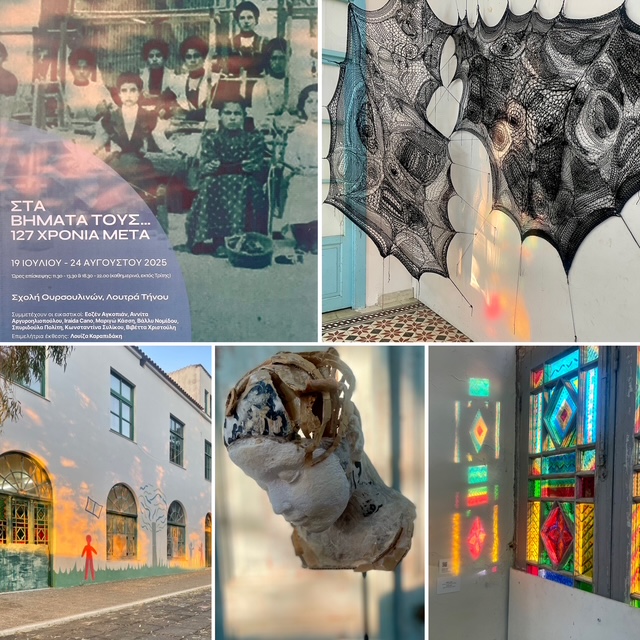 Καθώς πλησιάζω προς το τέλος αυτού του άρθρου, δεν μπορώ να μην σας πω για μία ξεχωριστή εικαστική έκθεση σε ένα από τα πιο ατμοσφαιρικά μέρη του νησιού, στο χωριό Λουτρά στη Σχολή της Μονής Ουρσουλινών. Η έκθεση, όπως το μαρτυρά ο τίτλος της «Στα βήματά τους… 127 χρόνια μετά/Ύφανση Μνήμης», πιάνει το νήμα από την υφαντική τέχνη που άνθισε στην Τήνο τον 19ο αιώνα, αφήνοντας πλούσια κληρονομιά, για να ανοίξει ζωηρό διάλογο με το σήμερα, μέσα από τα έργα οκτώ καταξιωμένων σύγχρονων εικαστικών γυναικών. Η έκθεση, σε επιμέλεια της Λουΐζας Καραπιδάκη, που θα είναι ανοιχτή έως τις 24 Αυγούστου, αποτίνει φόρο τιμής στην ιστορική Ζαρίφειο Βιοτεχνική Σχολή της Τήνου κι έχει ως σκοπό, όχι μόνο την έκφραση της καλλιτεχνικής δημιουργίας αλλά και την επαναδραστηριοποίηση και ενδυνάμωση της Σχολής.