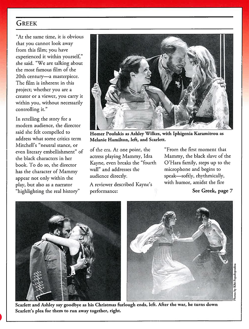 Ο John Wiley Jr κάνει εκτενή αναφορά στην πρόσφατη εξαιρετική κριτική, πάνω στην ελληνική διασκευή του «Όσα Παίρνει ο Άνεμος» από την Ιόλη Ανδρέαδη και τον Άρη Ασπρούλη, που πραγματοποίησε η Αμερικανίδα Καθηγήτρια Θέατρου και Προέδρος του Τμήματος Θεατρικών Σπουδών του Πανεπιστημίου του Brooklyn, Laura Tesman. Στο κείμενό του, φιλοξενεί, επίσης, δηλώσεις της σκηνοθέτιδας, αναφέρεται στη μεταφορά στη σκηνή δύο μνημειωδών λογοτεχνικών έργων μέσα από πρωτότυπες θεατρικές διασκευές, το "Πόλεμος και Ειρήνη" και το "Περηφάνια και Προκατάληψη", από τους δύο Έλληνες συγγραφείς πριν το «Όσα παίρνει άνεμος», και πραγματοποιεί ειδική μνεία στη μουσική του Γιώργου Παλαμιώτη για την παράσταση που «κάθε του τραγούδι προχωράει την ιστορία και βαθαίνει τους χαρακτήρες» του έργου. Το αφιέρωμα κλείνει με αναφορά στο εντυπωσιακό ρεκόρ προσέλευσης των 16.000 θεατών που κατέκλυσαν μέσα σε ένα μήνα τον Δημοτικό Θέατρο Πειραιά για να παρακολουθήσουν την παράσταση.
