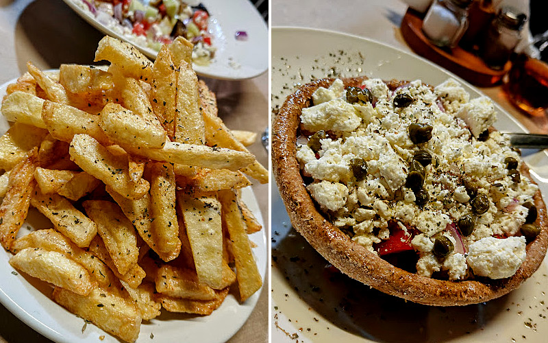 Ξεκινήσαμε με τη signature χωριάτικη σαλάτα, που είχε την ευχάριστη προσθήκη καπνιστής μελιτζάνας και σκόρδου, κομμένη με ακρίβεια σε κυβάκια, ενώ το τυροπιτάρι τους συμπληρώνει ιδανικά τα ορεκτικά, μαζί με το τζατζίκι, λιτό αλλά ουσιαστικό και «σκορδάτο». Να βάλουμε και μια πατάτες όμως ε; Και τι πατάτες! Φρεσκοκομμένες και τηγανισμένες στην εντέλεια, μαλακές μέσα και τραγανές απ’ έξω, με την ριγανίτσα τους. Αν είστε μεγάλη παρέα, αξίζει να τιμήσετε και την σαλάτα τύπου χωριάτικη που σερβίρουν μέσα σε μια φωλιά από τραγανό παξιμάδι. Εξαιρετική, όπως και η τηγανιά κοτόπουλο.