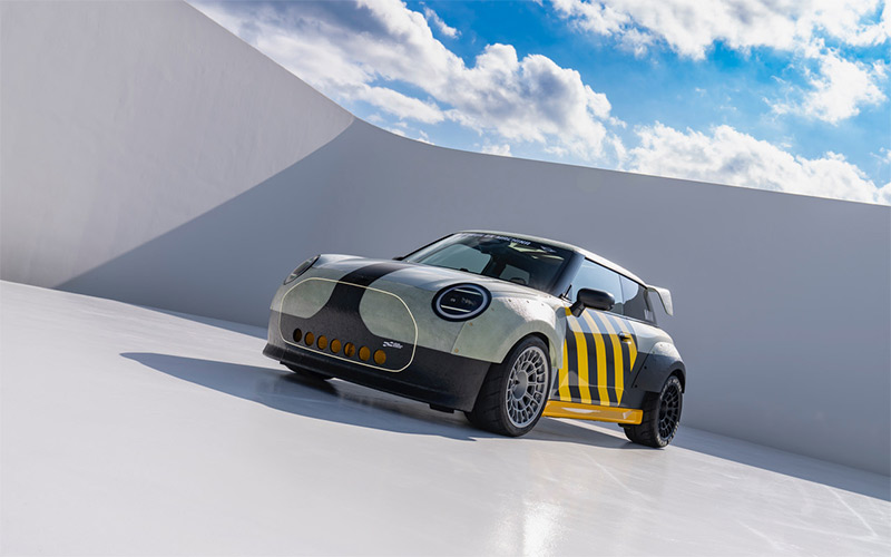 Το αμάξωμα δημιουργεί μία τολμηρή πρώτη εντύπωση με το έντονο κίτρινο και ασημί του φινίρισμα – μια αναφορά στην προοδευτική προσέγγιση της MINI στην ηλεκτρική κινητικότητα. Τα φαρδιά φτερά, η φωτιζόμενη μάσκα και η αεροτομή οροφής τονίζουν τη σιλουέτα, ενώ τα ημιδιαφανή πάνελ από υαλονήματα μειώνουν το βάρος του αυτοκινήτου κατά 15% και βελτιώνουν την αεροδυναμική του απόδοση.