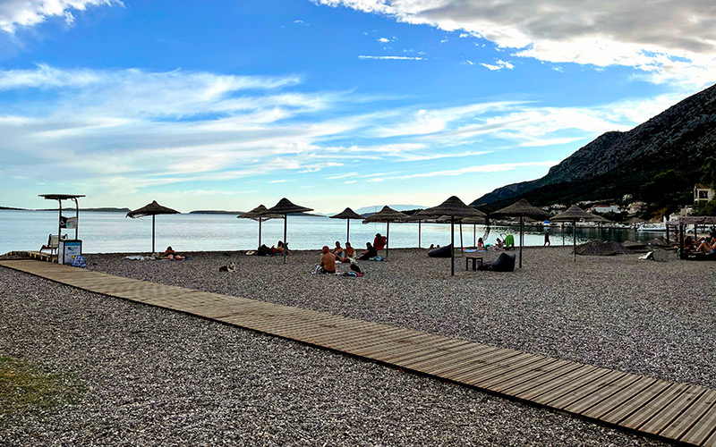 Συμπαθέστατη είναι καταρχάς η μικρή παραλιούλα στην άκρη της προκυμαίας (φωτό, κάτω): Με ψιλό βοτσαλάκι, νερά που βαθαίνουν απότομα για να χαίρονται όσοι βαριούνται να περπατούν στα ρηχά για να κολυμπήσουν, δωρεάν ψάθινες ομπρέλες για να στρώσεις από κάτω την πετσετούλα σου, και σύστημα πρόσβασης για ΑμεΑ στη θάλασσα. Το Aqua, ακριβώς από πάνω της, απλώνει τραπεζάκια στο πλακόστρωτο πίσω από την παραλία, και φροντίζει και για τις προμήθειές σου σε takeaway καφέ, τσιμπολογήματα και παγωμένες μπύρες όσο αράζεις στην ακροθαλασσιά.