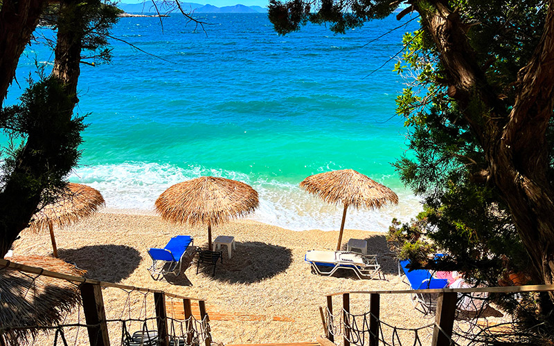 Επίσης βοτσαλωτή και γλυκύτατη, κι αυτή με ψάθινες ομπρέλες που δεν χρεώνονται, είναι η παραλία κάτω από τη Μονή Αγίου Γεωργίου, λίγο έξω από τον Αστακό. Δεν θα τη βρεις στο Google Maps, θα ακολουθήσεις απλά την πινακίδα που γράφει «προς παραλία» αμέσως μετά το μοναστήρι, στον δρόμο που πηγαίνει από τον Αστακό προς την Πάλαιρο.