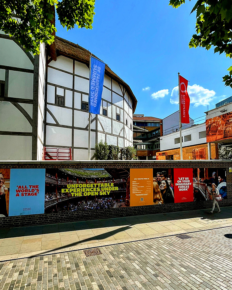 Μακριά από κάθε είδους σοβαροφάνειες, το The Globe βάζει τον Σαίξπηρ στην καθημερινότητα, τον κάνει γήινο, τωρινό, δικό σου άνθρωπο. Στο πωλητήριο πουλάνε μπλουζάκια που γράφουν A plague on both your houses (τη διάσημη κατάρα του Μερκούτιου στον Ρωμαίο και την Ιουλιέτα, που εύχεται πεθαίνοντας «πανούκλα και στα δύο σας τα σπίτια») ενώ μια πινακίδα απαγορεύει τις ξιφομαχίες σε εσωτερικούς χώρους. Έξω στην αυλή, κυματίζουν πολύχρωμες σημαίες με το λογότυπο του θεάτρου, πάνω από τα μπάνερ που υπενθυμίζουν πως «Όλος ο κόσμος είναι μια σκηνή». Πράγματι.