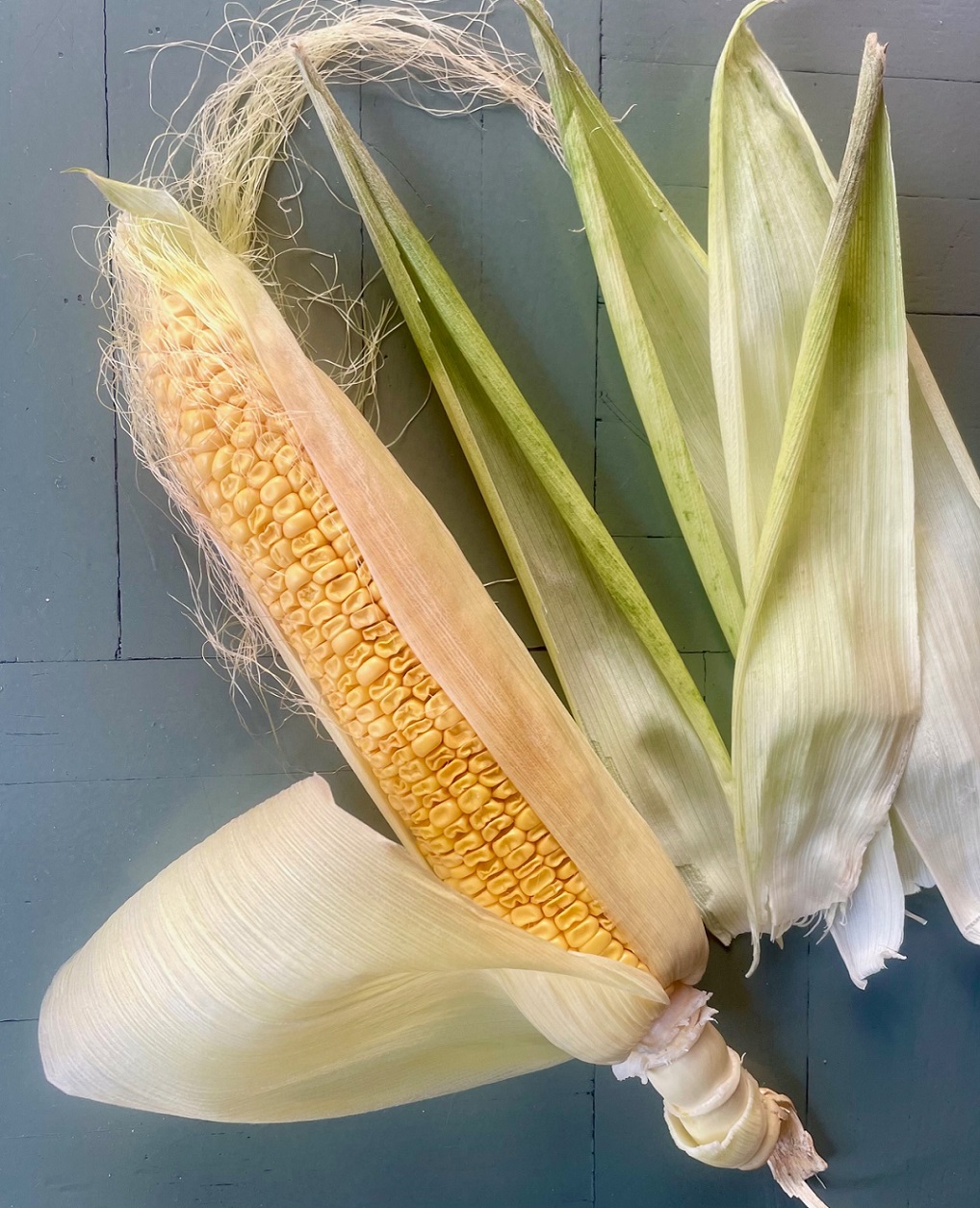 Σε βαθύ τηγάνι ή ρηχή κατσαρόλα πλασοτέ ζεσταίνουμε λίγο εξαιρετικό παρθένο ελαιόλαδο (τόσο ώστε να καλύπτει τον πυθμένα του σκεύους) και σοτάρουμε 250 γρ. κουσκουσάκι, σε μέτρια προς δυνατή φωτιά, μέχρι να καβουρδιστεί και να πάρει ελαφρύ χρώμα, ανακατεύοντας συνεχώς με ξύλινη κουτάλα. Καλύπτουμε με βραστό νερό, χαμηλώνουμε τη φωτιά και βράζουμε για λίγα λεπτά (όχι παραπάνω από 8΄ γιατί θα μαγειρευτεί λίγο ακόμη αργότερα) μέχρι να μαλακώσει το ζυμαρικό, με προσοχή να μην λιώσει. Στραγγίζουμε, αλατίζουμε, προσθέτουμε λίγο ελαιόλαδο για να μην κολλήσουν οι πέρλες μεταξύ τους, ανακατεύουμε απαλά και αφήνουμε προς το παρόν στην άκρη. Παράλληλα, σε μικρό κατσαρολάκι, ζεματίζουμε τα σπόρια από ένα μεγάλο νωπό καλαμπόκι σε αλατισμένο νερό για λίγα λεπτά (όχι παραπάνω από 3-4). Στραγγίζουμε κι αφήνουμε προς το παρόν στην άκρη.