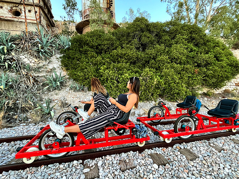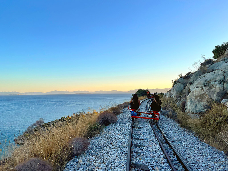 Όμως πριν και πάνω και πιο πολύ απ’ όλα, χαϊλάητ της διαδρομής είναι η συγκλονιστική της θέα στην θάλασσα από τη μια και στα βουνά που υψώνονται προς τον ουρανό από την άλλη. Ανάμεσά τους, οι σιδηροδρομικές γραμμές απλώνονται ως εκεί που φτάνει το μάτι, δημιουργώντας στους ρομαντικότερους εξ ημών την καθησυχαστική αίσθηση της χωροχρονικής συνέχειας. Κι ίσως αυτός να είναι ένας λόγος που το railbiking θα σου φέρει κάποια στιγμή στο νου εκείνο το επαίσχυντο κλισέ που λέει να μετράς τη ζωή σε στιγμές που σου κόβουν την ανάσα.