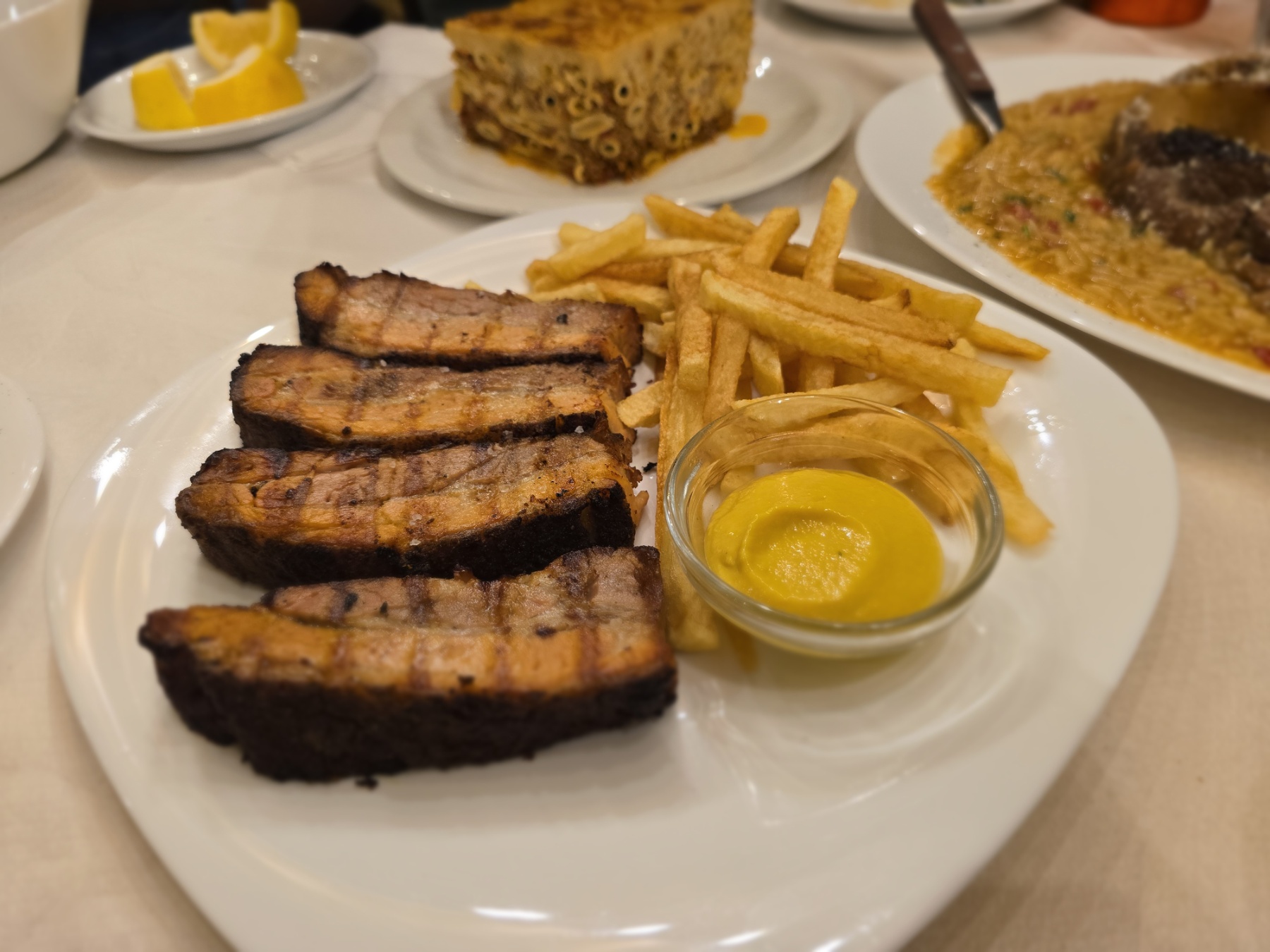 Στα του κρέατος, παραμένουν σταθερή αξία οι ζουμερές μπριζόλες (χοιρινές και μοσχαρίσιες), το γεμιστό μπιφτέκι, το λουκάνικο πρασάτο, ενώ κάποιες καθημερινές – λόγου χάρη τις Πέμπτες που έχει ζωντανή μουσική - ο σεφ δημιουργεί και μερικές μερακλίδικες επιλογές όπως τηγανιά κοτόπουλο, οσομπούκο με κριθαράκι και μια σιγομαγειρεμένη πανσέτα στο φούρνο για 7-10 ώρες που ολοκληρώνεται στο γκριλ και λιώνει στο στόμα.