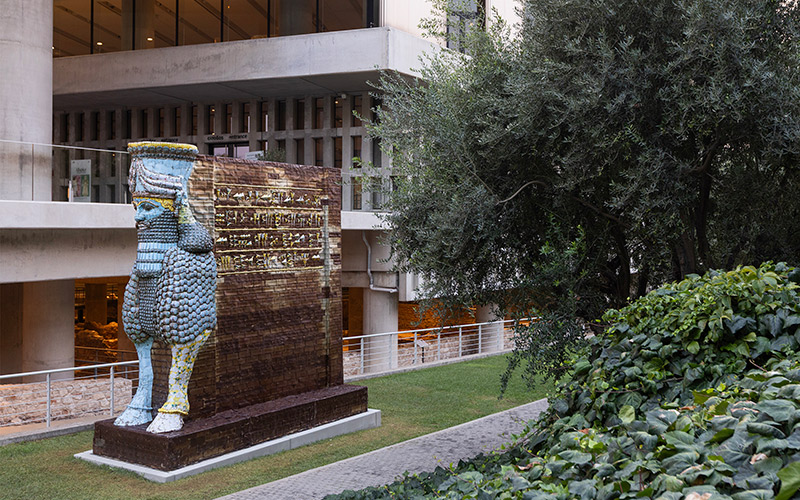 Το Lamassu of Nineveh του Michael Rakowitz είναι ένα γιγάντιο γλυπτό στο προαύλιο του Μουσείου της Ακρόπολης, στην πλευρά που κοιτάζει προς την οδό Μητσαίων. Είναι φτιαγμένο από κονσέρβες σιροπιού χουρμά από το Ιράκ και αποτελεί «επανεμφάνιση» του αγάλματος φτερωτού ταύρου μήκους περίπου 4,3 μέτρων, της ασσυριακής θεότητας που προστάτευε την είσοδο της Πύλης Νεργκάλ της Νινευή από το 700 π.Χ. μέχρι τον Φεβρουάριο του 2015, όταν το ISIS το κατέστρεψε κι αυτό μαζί με άλλα σπουδαία έργα στο κοντινό Μουσείο της Μοσούλης.