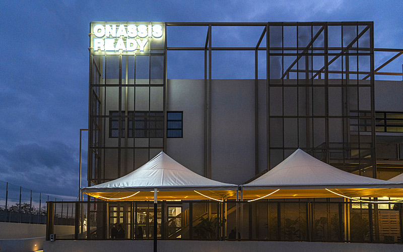 Το πρώην εργοστάσιο πλαστικών που στεγάζει εδώ και λίγες μέρες το Onassis Ready κυριαρχεί μέσα σε αυτή την εικόνα: Το κτίριο συνδυάζει τον καθαρό βιομηχανικό μοντερνισμό με ένα ανάλαφρο κέλυφος που το επανανοηματοδοτεί. Η αντίθεση ανάμεσα στο συμπαγές και το διάφανο, στο βαρύ και το ελαφρύ, καθορίζει τη σύνθεση: το παλιό κτίριο μοιάζει να προστατεύεται αλλά και να αναδεικνύεται μέσα από το νέο του σκελετό από μέταλλο και σύρμα. Το αποτέλεσμα είναι έντονα γλυπτικό, συνδυάζοντας την τεχνολογική αισθητική με μια ποιητική αφαίρεση.
