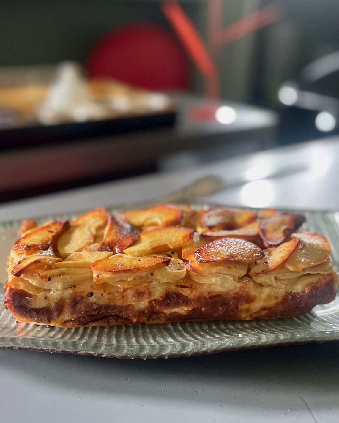 Η ιδέα της Eryn Folle – αυτό είναι το όνομα της εφευρέτριας – είναι ουσιαστικά πολύ απλή: Τα μήλα, κομμένα σε πολύ λεπτές φέτες, βουτάνε σε έναν ελαφρύ χυλό, στρώνονται ομοιόμορφα κι όταν ψήνονται και η μηλόπιτα κόβεται, η ζύμη/χυλός σχεδόν δεν φαίνεται. Αν μάλιστα το στρώσιμο είναι ιδιαιτέρως επιμελές, το γλυκό μοιάζει με μιλφέιγ και γι' αυτό κάποιοι το ονομάζουν μηλόπιτα-μιλφέιγ. Στην υφή, η μηλόπιτα είναι ανάλαφρη επειδή το αλεύρι είναι ελάχιστο σε αναλογία με τα μήλα, τα φρούτα είναι μαλακά και τραγανά συγχρόνως, και το άρωμά τους σπάει μύτες, με μοναδικό αρωματικό στοιχείο τη βανίλια, την πραγματική, βεβαίως. Η ανάλαφρη υφή της παραπέμπει αμυδρά στο άλλο εμβληματικό γαλλικό γλυκό, το κλαφουτί (δείτε εδώ και εδώ δύο συνταγές) και εικάζω ότι η Eryn Folle από αυτό πήρε έμπνευση για την αόρατη μηλόπιτά της.
