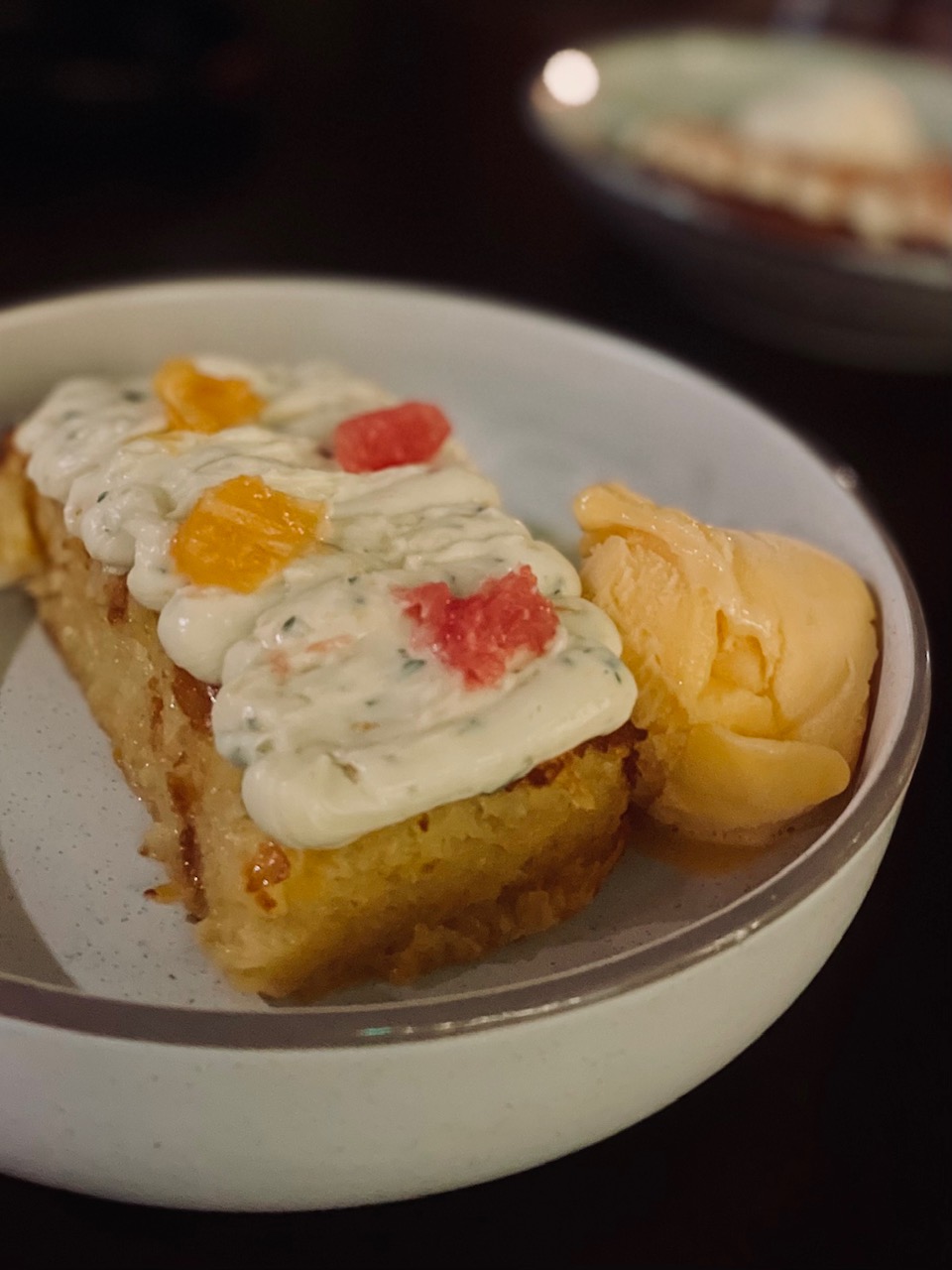 Η πορτοκαλόπιτα (€ 12) είναι, ως οφείλει, ζουμερή αλλά όχι πνιγμένη στο σιρόπι, αρωματική και δροσάτη, με τόπινγκ βελουδένιας κρέμας αρωματισμένης με πορτοκάλι και λουΐζα κι ένα φινετσάτο ξινούτσικο σορμπέ πορτοκάλι. Το τσουρέκι-εκμέκ με μαστιχωτό παγωτό καϊμάκι (€ 11) είναι γλυκό αλλά καθόλου λιγωτικό, εωδιαστό από το μαχλέπι και τη μαστίχα.