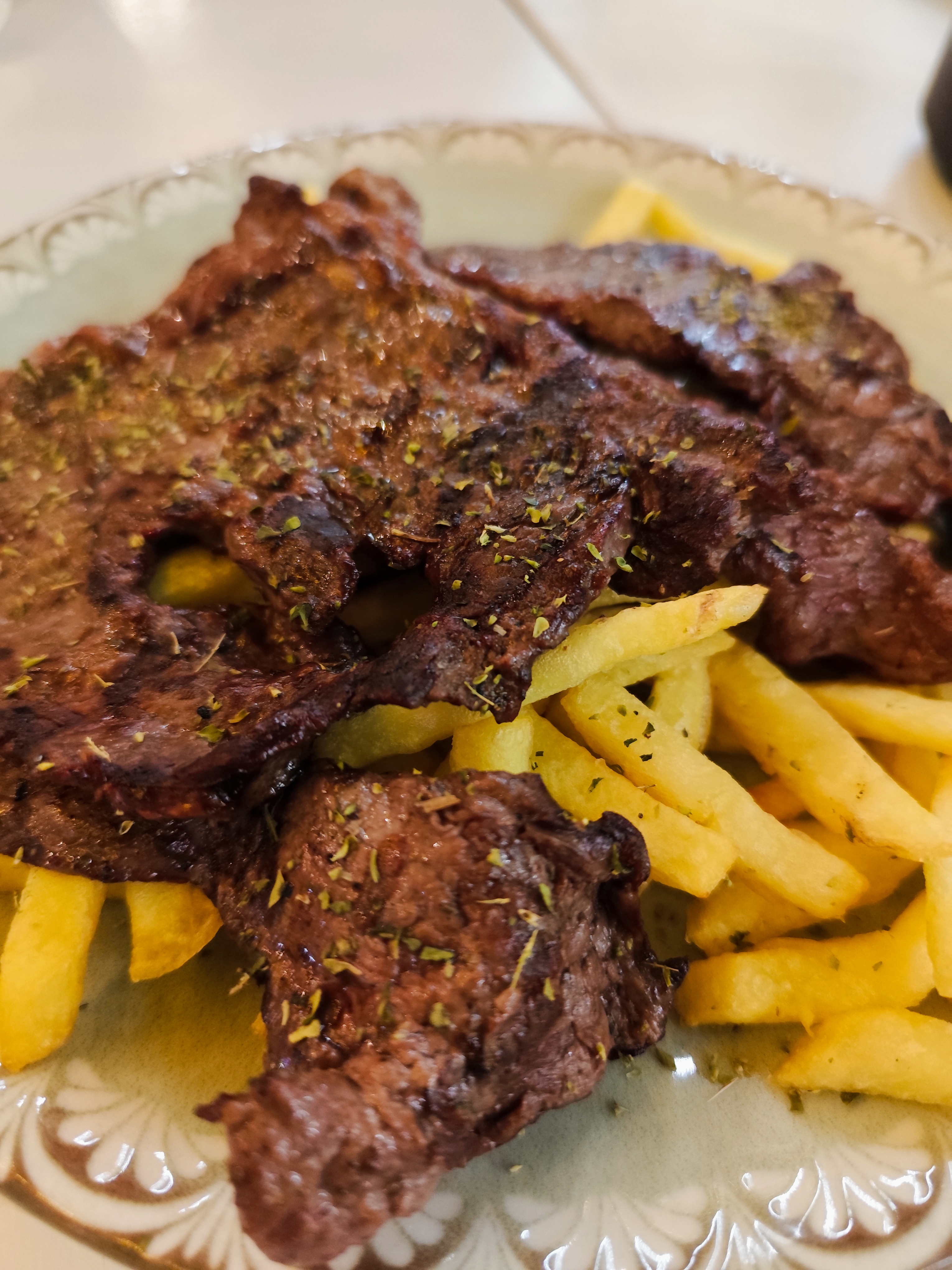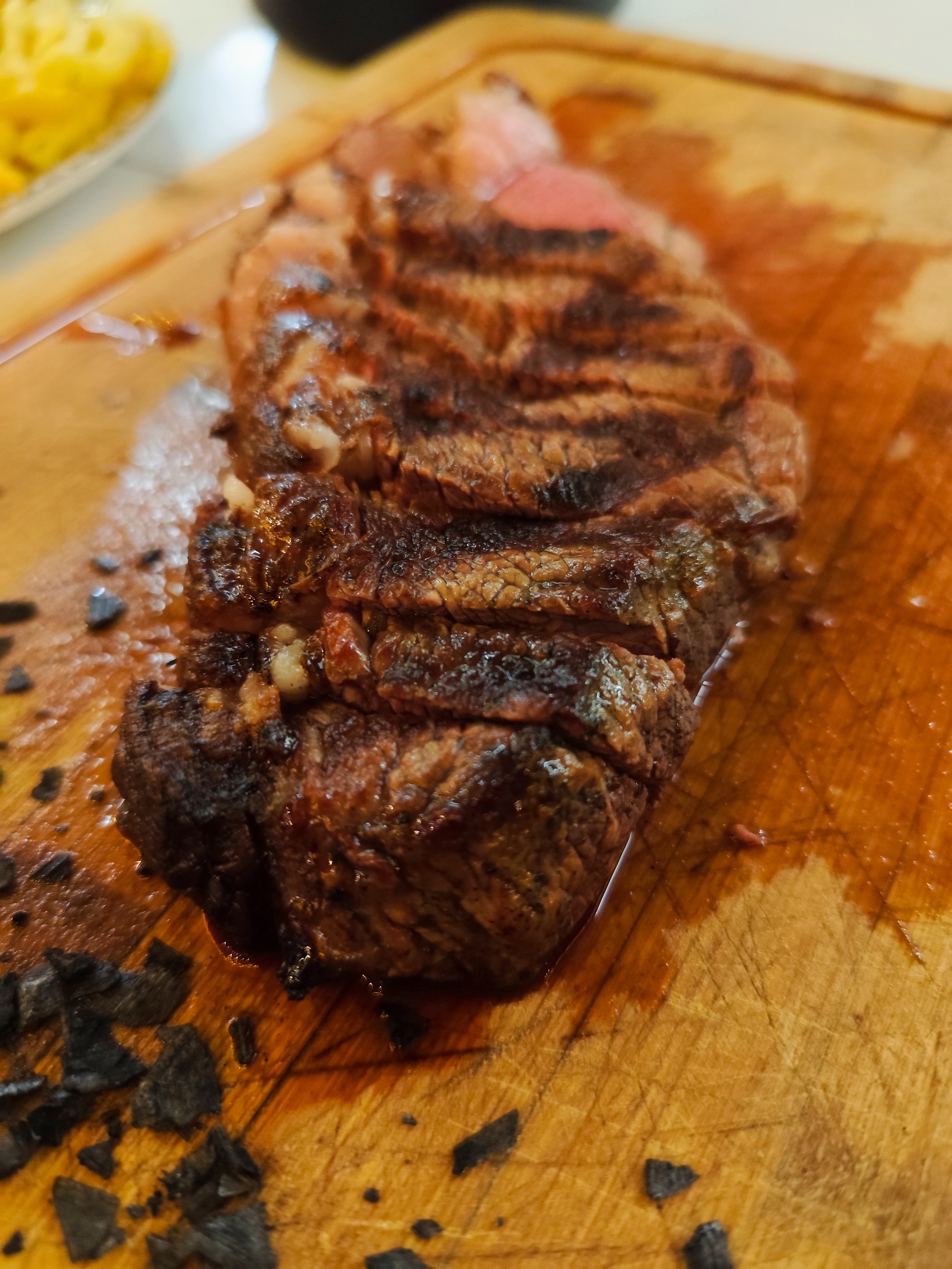 Στη συνέχεια ήρθαν τα φιλετάκια πρόβατο (14€ η μερίδα/32€ το κιλό) χωρίς καθόλου λιπάκι, ζουμερά κι όσο πρέπει αλατισμένα και μαριναρισμένα ώστε να μην σκεπάζουν τα καρυκεύματα τη νοστιμάδα του καλοψημένου κρέατος. Έπειτα δοκιμάσαμε το μοσχαρίσιο διάφραγμα (95€ το κιλό) του καταλόγου σε medium ψήσιμο όπως συστήνεται δηλαδή. Σε μια ξύλινη κοπή κοβόταν μπροστά στα μάτια μας και συνοδευόταν μονάχα από μαύρο χοντρό αλάτι. Ζουμερό και πεντανόστιμο άξιζε μέχρι σεντ τα λεφτά του.