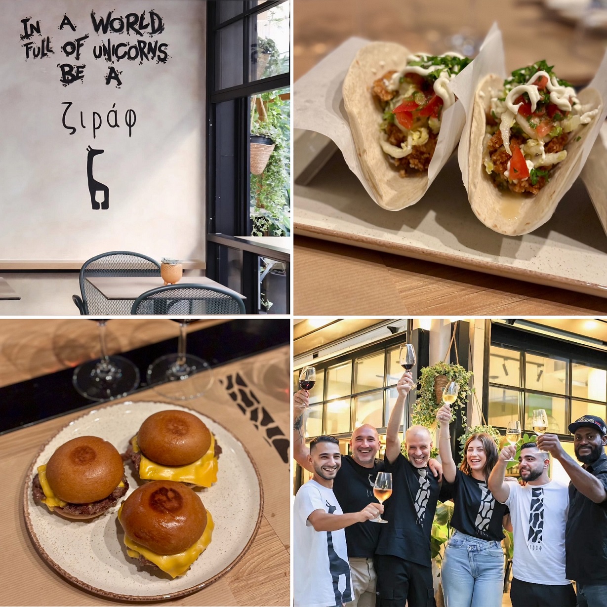 Ήταν κατακαλόκαιρο όταν στο προφίλ του αγαπητού μου Βασίλη Παπαδόπουλου στο Instagram εμφανίστηκε από το πουθενά μια μαυρόασπρη… καμηλοπάρδαλη. Την άλλη μέρα είδα τον ίδιο τον Βασίλη να κρατάει μια ταμπέλα της οδού Καλλιδρομίου κι από πίσω ένα γιαπί. Ωπ, είπα μέσα μου, κάτι γίνεται εδώ. Μετά, καθώς περνούσαν οι καυτές μέρες με τις καλοκαιρινές διακοπές ενδιάμεσα, κάπου το ξέχασα, ώσπου στο τέλος του Αυγούστου να ‘σου η πρώτη επίσημη φωτογραφία του Ζιράφ, του wine bar στο οποίο ο Βασίλης και δυο καλοί του φίλοι, ο William Δράκος και ο Γιάννης Τερψίδης, έδωσαν ζωή στο όνειρό τους να φτιάξουν ένα μέρος όπου σμίγουν οι παρέες με καλό κρασί, νόστιμες γεύσεις και όμορφη, ζεν ατμόσφαιρα.