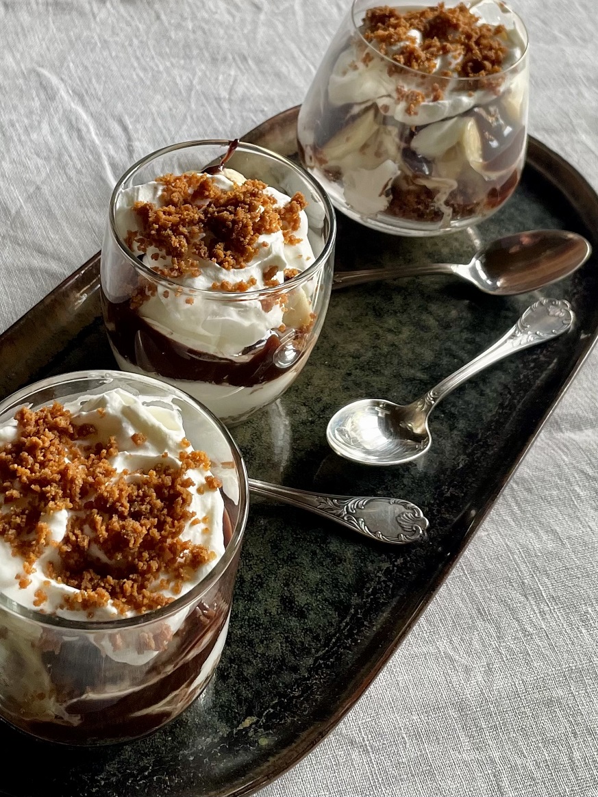 Το banoffee, το κανονικό, δεν το συμπαθώ καθόλου γιατί έτσι παραφορτωμένο που είναι, με λιγώνει και με μπουχτίζει από την πρώτη μπουκιά. Σε αυτή την ανάλαφρη εκδοχή η ζάχαρη είναι μετρημένη, απουσιάζει η βαριά ζύμη-βάση και η sauce δεν γίνεται με ζαχαρούχο γάλα. Έτσι, το γλυκό αποκτά φινέτσα και γίνεται ιδανικό για το τέλος ενός γεύματος.