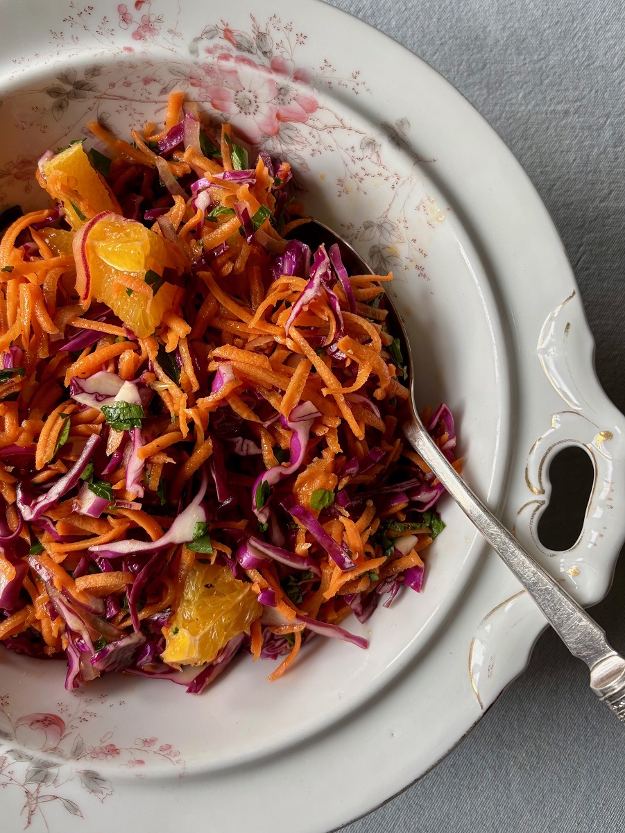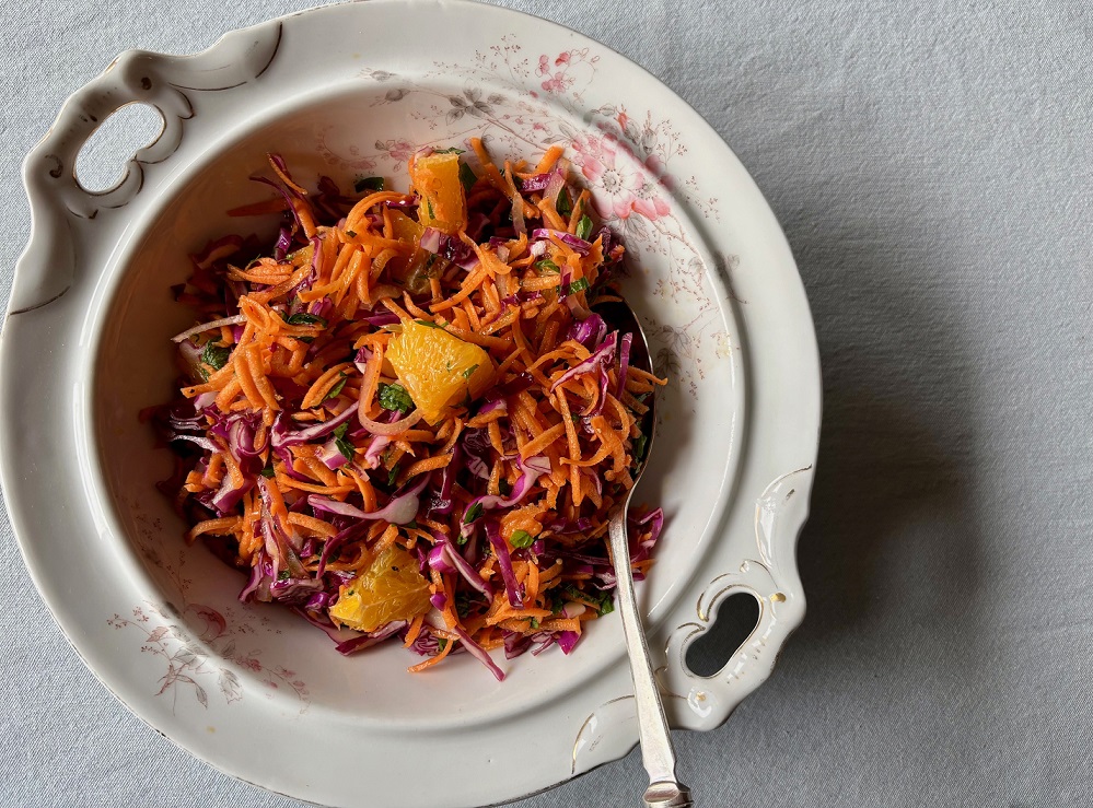 Βγάζουμε το ξύσμα από 1 μεγάλο πορτοκάλι και το βάζουμε σε μικρό μπολ στο οποίο μετά θα φτιάξουμε το dressing. Κόβουμε σε λεπτά μισοφέγγαρα 1 μέτριο ξερό κρεμμύδι και τα βαπτίζουμε για λίγη ώρα σε μπολ με παγωμένο νερό και παγάκια: έτσι γίνεται λιγότερο αψύ (βλ. tips). Τρίβουμε 2 μεγάλα καρότα και τα βάζουμε σε μεγάλο μπολ. Κόβουμε σε λεπτές λωρίδες ½ μικρό κόκκινο λάχανο και τις προσθέτουμε στα καρότα. Καθαρίζουμε το πορτοκάλι, το κόβουμε σε χοντρουλές φέτες και κάθε φέτα στα 4 και τις βάζουμε κι αυτές στο μπολ με τα υπόλοιπα υλικά. Ψιλοκόβουμε ½ μάτσο μαϊντανό και ½ δυόσμο και τα προσθέτουμε στο μπολ. Τέλος, προσθέτουμε το κρεμμύδι, αφού το στραγγίσουμε καλά.