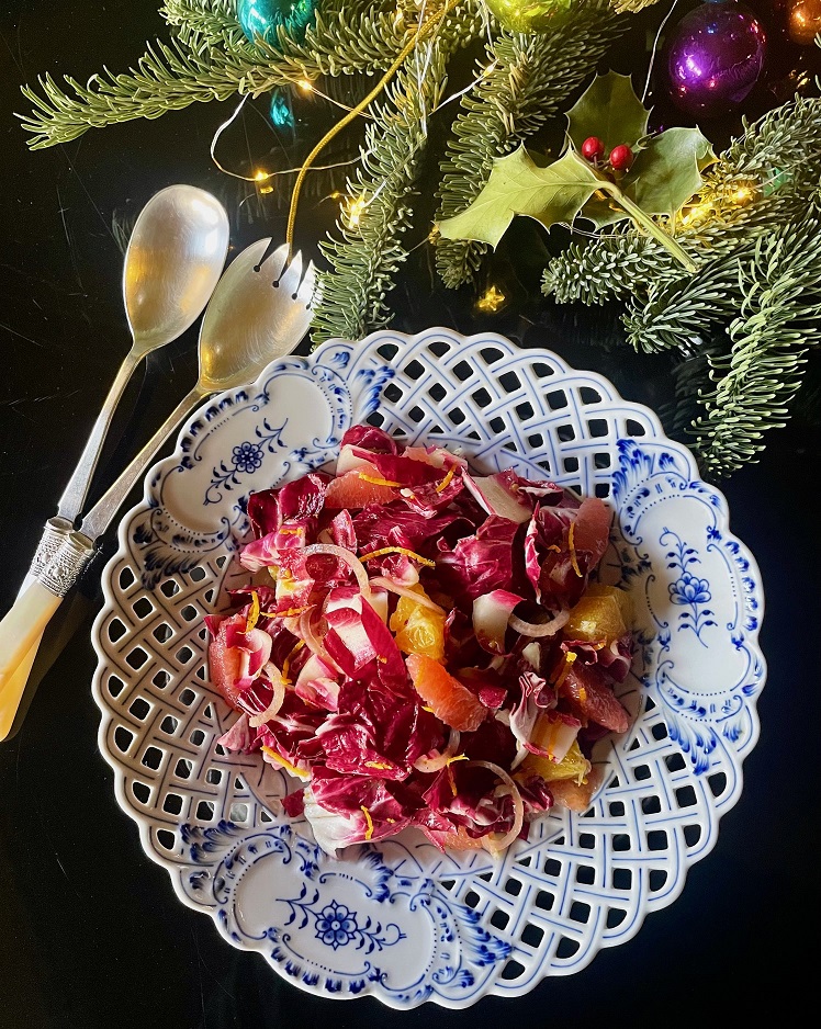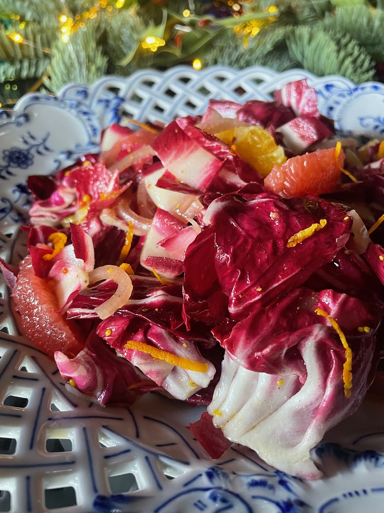 Κόβουμε 1 radicchio στα δύο, αφαιρούμε το σκληρό μεσαίο κοτσάνι και τα εξωτερικά φύλλα, ξεχωρίζουμε τα υπόλοιπα και τα κόβουμε με τα δάχτυλά όπως. Κόβουμε 4 endives (σικορέ) κατά προτίμηση κόκκινου χρώματος (βλ. tips) με μαχαίρι σε φέτες, αφού πρώτα αφαιρέσουμε το κάτω σκληρό μέρος και τα εξωτερικά φύλλα. Βάζουμε τα λαχανικά σε μπολ και προσθέτουμε το ξύσμα από 1 πορτοκάλι και λεπτές ροδέλες από 1 ξερό κρεμμύδι που έχουμε βαπτίσει για λίγη ώρα σε μπολ με παγωμένο νερό και παγάκια ή, εάν έχουμε, πίκλες κρεμμυδιού (η συνταγή εδώ).