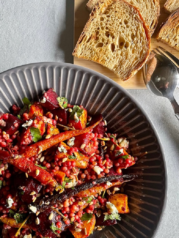 ΖΕΣΤΗ ΣΑΛΑΤΑ ΜΕ ΓΛΥΚΟΠΑΤΑΤΕΣ, ΠΑΝΤΖΑΡΙΑ, ΚΑΡΟΤΑ, ΡΟΚΦΟΡ & ΚΟΥΣΚΟΥΣΑΚΙ