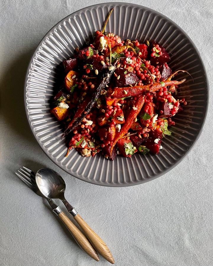 Καθαρίζουμε και κόβουμε σε χοντρουλές φέτες 2 γλυκοπατάτες, 4 παντζάρια και 6-8 καρότα (αναλόγως του μεγέθους τους – εάν είναι χοντρά, τα κόβουμε κατά μήκος στη μέση). Τα αραδιάζουμε στη λαμαρίνα του φούρνου που έχουμε στρώσει με λαδόκολλα, τα ραντίζουμε με ελαιόλαδο και τα πασπαλίζουμε με αλάτι και μπαχαρικά: 1 κ.γλ. κουρκουμά σε σκόνη, 1 κ.γλ. κύμινο (σε σπόρους ή σκόνη), 1 κ.γλ. κόλιανδρο σε σκόνη, 1 κ.γλ. πάπρικα (καπνιστή ή γλυκιά) και πιπέρι. Τα ανακατεύουμε καλά και τα ξαναβάζουμε σε διάταξη στη λαδόκολλα. Ψήνουμε σε προθερμασμένο φούρνο στους 190ο C στη λειτουργία του αέρα μέχρι τα λαχανικά να μαλακώσουν και να μελώσουν (τα παντζάρια και τα καρότα, για να μαλακώσουν εντελώς, χρειάζονται λίγο περισσότερο χρόνο ψησίματος και αν τα θέλετε πολύ μαλακά, θα τα βάλετε στον φούρνο περίπου 10’ νωρίτερα από τις γλυκοπατάτες. Εγώ δεν το έκανα γιατί αυτά τα δύο λαχανικά δεν μου αρέσουν πολύ μαλακά και βρίσκω αυτήν ακριβώς τη διαφορά στις υφές πολύ ενδιαφέρουσα).