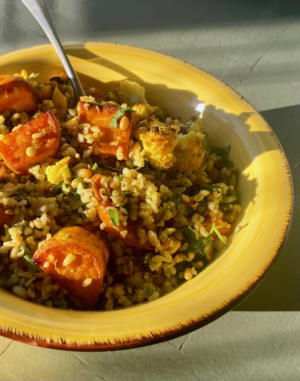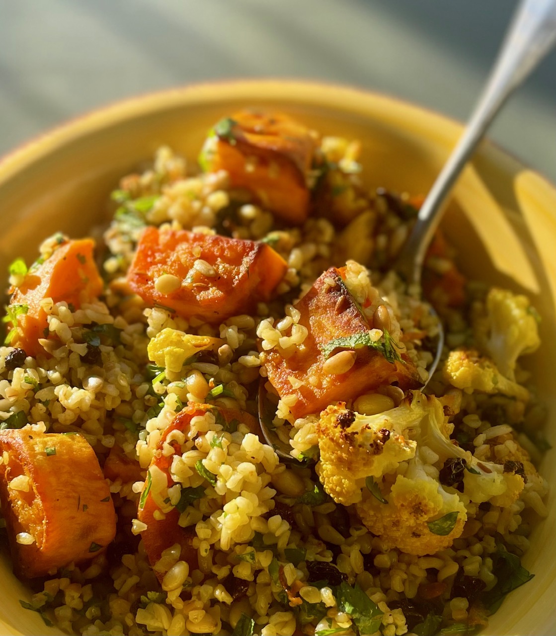 Όση ώρα ψήνονται τα λαχανικά βράζουμε σε άφθονο αλατισμένο νερό 1 φλ. τσ. πλιγούρι για περίπου 15’-20’, μέχρι να ψηθεί αλλά να μείνει σπυρωτό. Το στραγγίζουμε, το βάζουμε σε μεγάλο μπολ, το περιχύνουμε με λίγο εξαιρετικό παρθένο ελαιόλαδο για να μην κολλήσει και το αφρατεύουμε απαλά με πιρούνι. Παράλληλα, καβουρδίζουμε σε μέτρια φωτιά μια χούφτα κουκουναρόσπορους και μια χούφτα ηλιόσπορους. Όταν είναι έτοιμα τα λαχανικά τα βάζουμε στο μπολ με το πλιγούρι και προσθέτουμε τους καβουρδισμένους σπόρους, καθώς και 1 γερή χούφτα μαύρης Κορινθιακής σταφίδας.