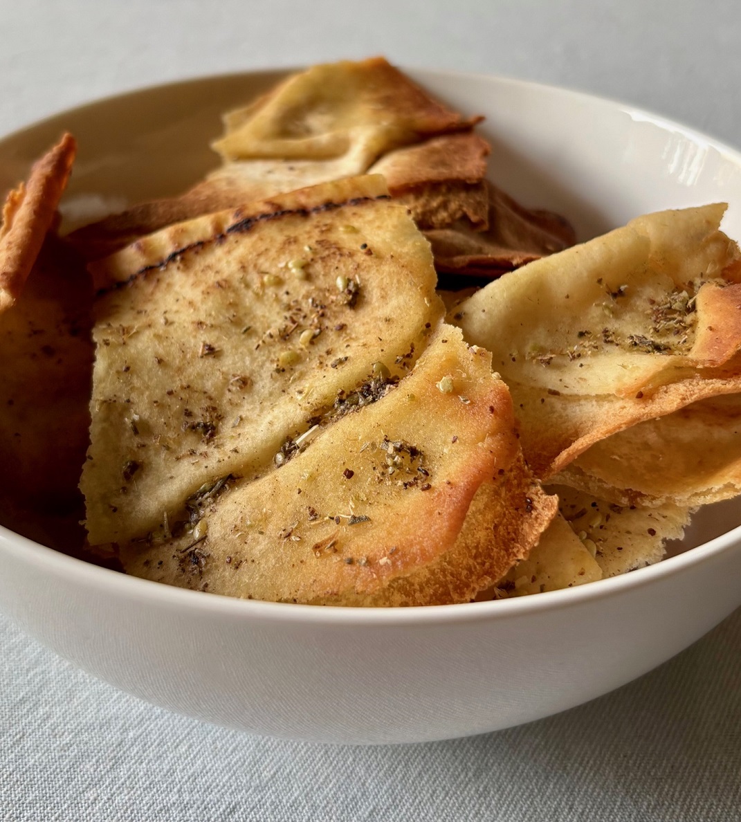 Κόβουμε αραβικές πίτες σε ακανόνιστα κομμάτια, τις αλείφουμε με λίγο ελαιόλαδο και za’atar, τις αραδιάζουμε στη λαμαρίνα του φούρνου που έχουμε στρώσει με λαδόκολλα και τις ψήνουμε σε προθερμασμένο φούρνο στους 180o C μέχρι να ροδοκοκκινίσουν και να γίνουν τραγανές. Βρίσκουμε za’atar σε καταστήματα μπαχαρικών, delicatessen και έθνικ παντοπωλεία. Αν δεν έχετε, μπορείτε να το αντικαταστήσετε αναμιγνύοντας ξερή ρίγανη, ξερή μαντζουράνα και σουσάμι, με διαφορετικό αρωματικό αποτέλεσμα. Οι πίτες τρώγονται ωραιότατα και μόνες τους σαν σνακ, πολύ πιο υγιεινό από τα τσιπς, ας πούμε.