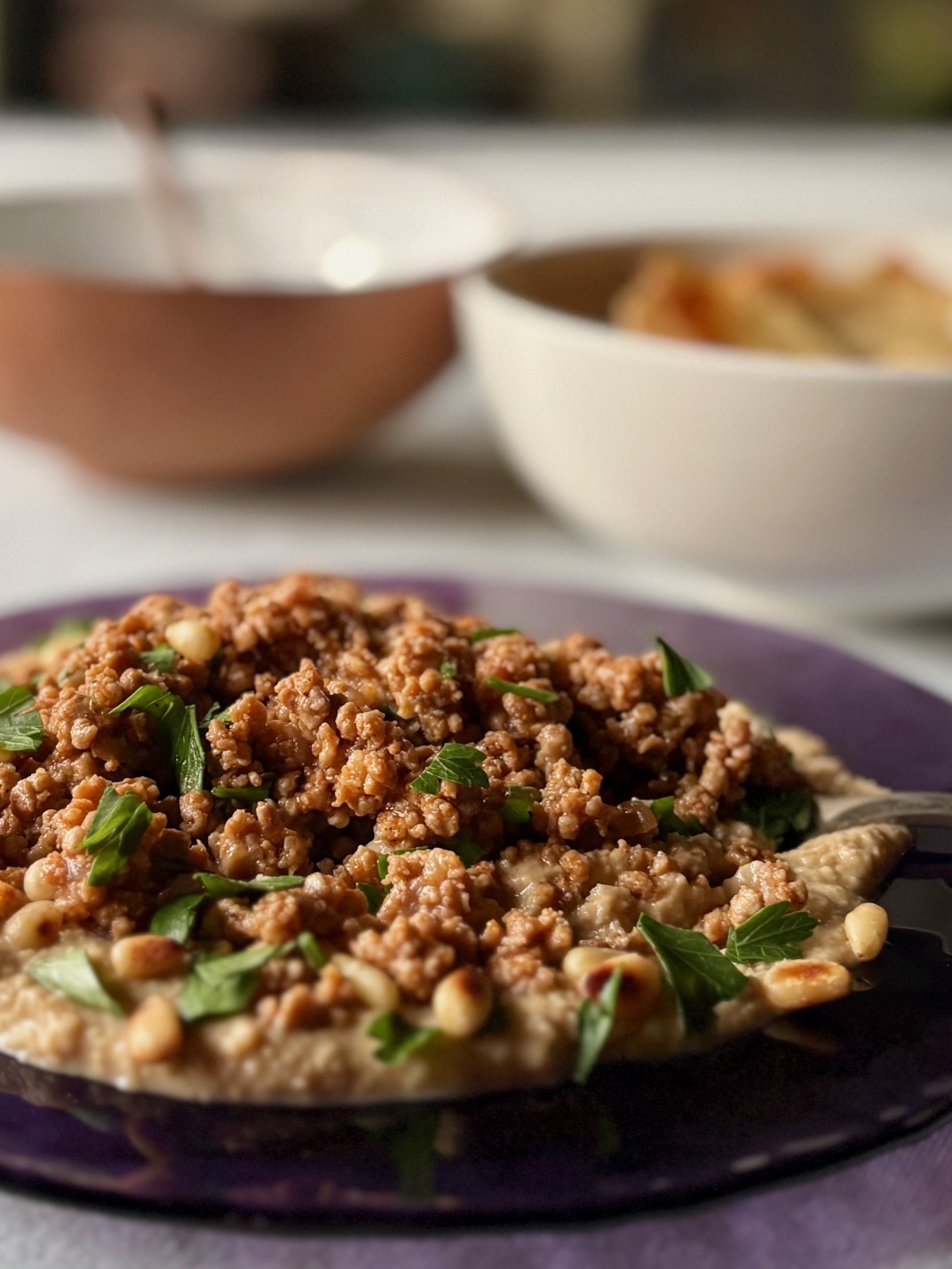 Μια άλλη δική του συνταγή με ενέπνευσε για το φαγητό που σας δείχνω σήμερα. Ονομάζεται حُمُّص بالقاورما (‘Hummus bi al-qawarma’ όπου η λέξη ‘qawarma ‘προέρχεται από την τουρκική ‘kavurma’ που περιλαμβάνει και τα δικά μας ομώνυμα παρασκευάσματα από κρέας), κατάγεται από τον Λίβανο και πρόκειται για ψιλοκομμένο αρνί που σοτάρεται σε δυνατή φωτιά με μπαχαρικά και σερβίρεται πάνω σε χούμους. Για μεγαλύτερη ευκολία αντικατέστησα το ψιλοκομμένο κρέας με κιμά, άλλαξα λίγο τα μπαχαρικά κι έκανα τον κιμά πικάντικο. Άλλωστε, όπως γράφω στον τίτλο, μαγείρεψα το φαγητό στα χνάρια του Ottolenghi, όχι σαν τον ίδιο. Όσοι το μοιραστήκαμε, ενθουσιαστήκαμε με τη νοστιμιά του.